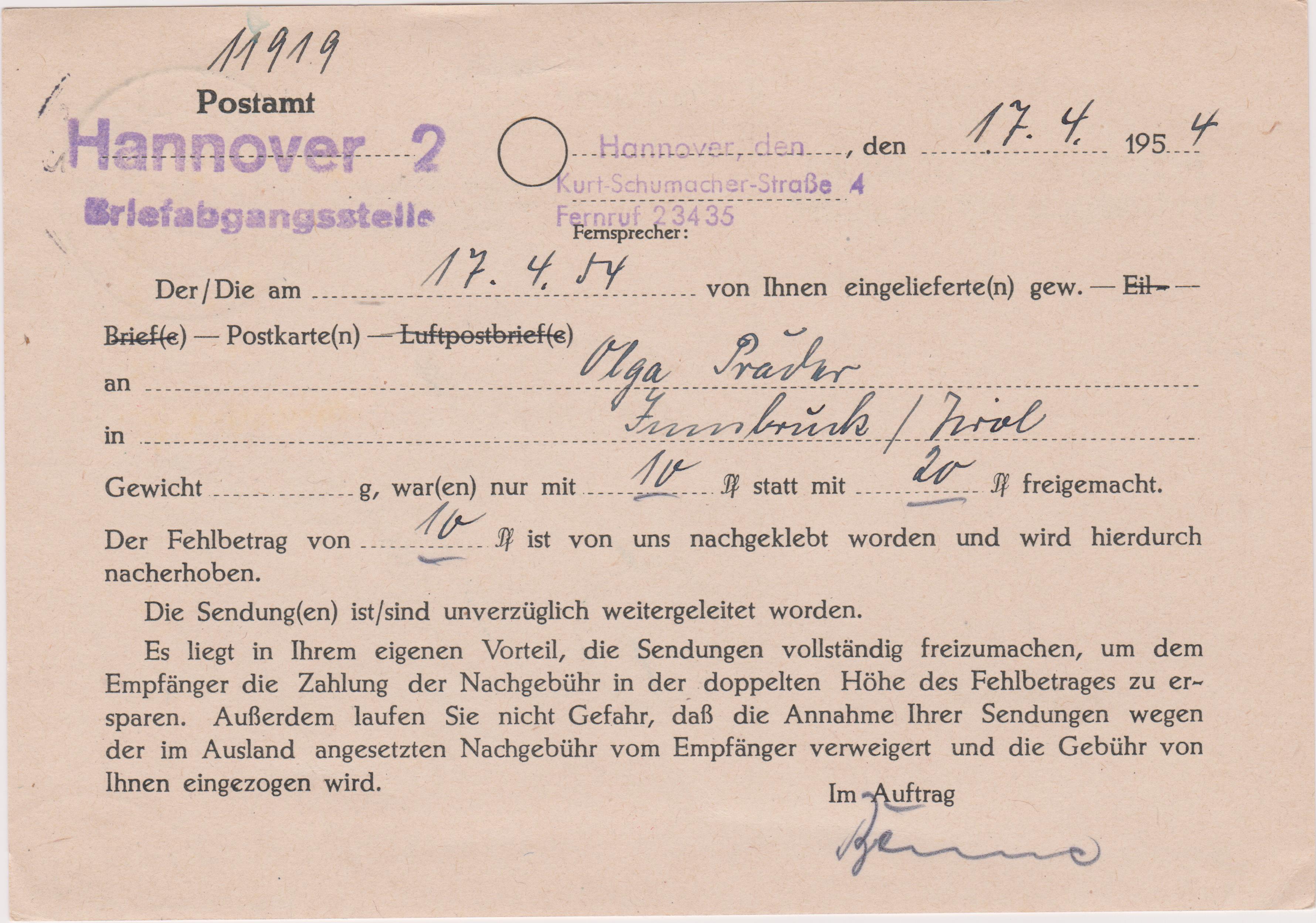 Die zusätzliche Frankatur wurde am 16.07.2017 im BZ 70 per Handrollstempel entwertet und der Beleg wurde heute, 17.07.2017, zugestellt.