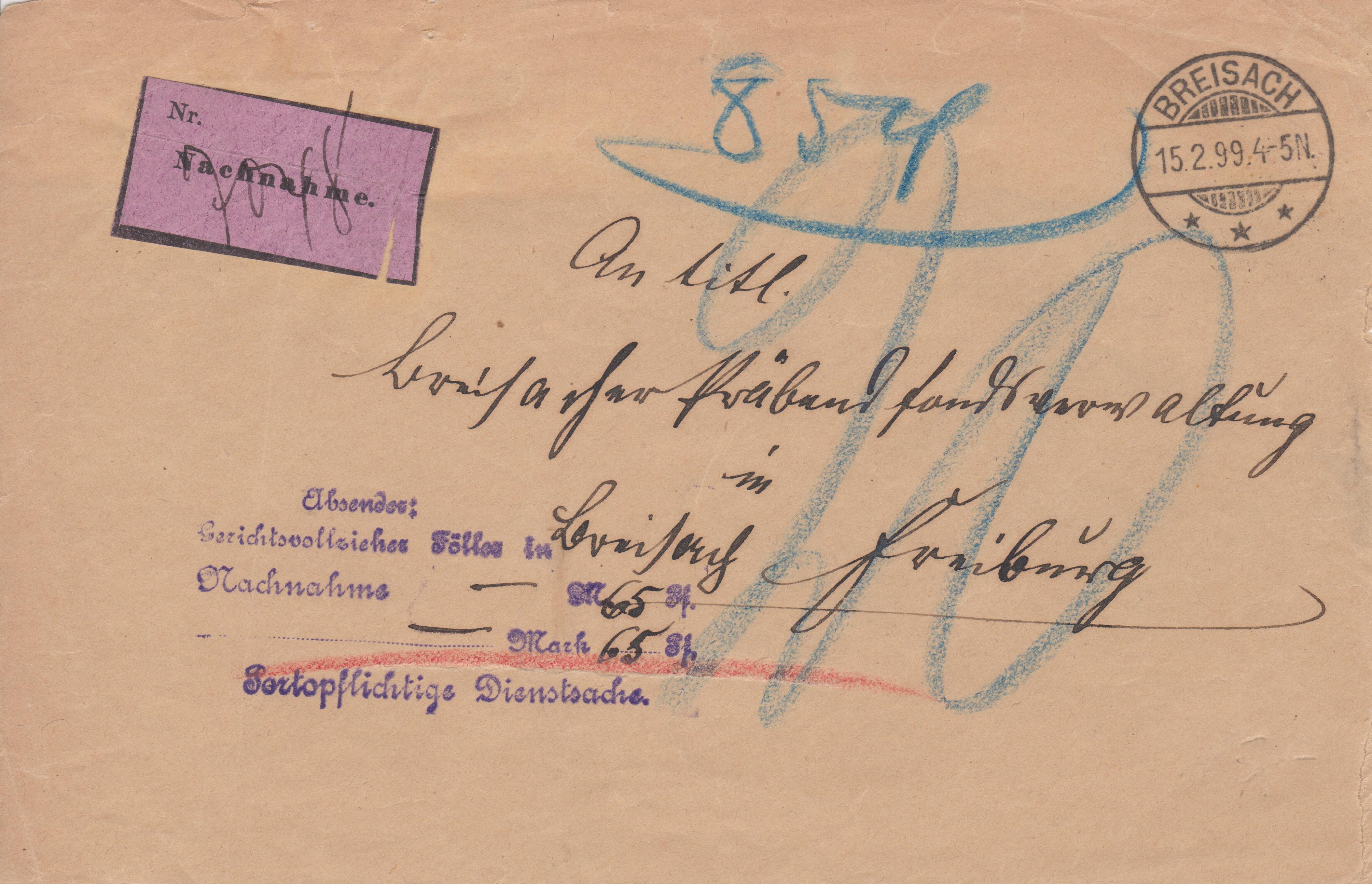 Das Porto von "50" Pfennig für einen Brief im Ortsverkehr, 10 Pf, per Einschreiben, 40 Pf, wurde per Blaustift vermerkt und vom Empfänger als "Nachgebühr" eingezogen.