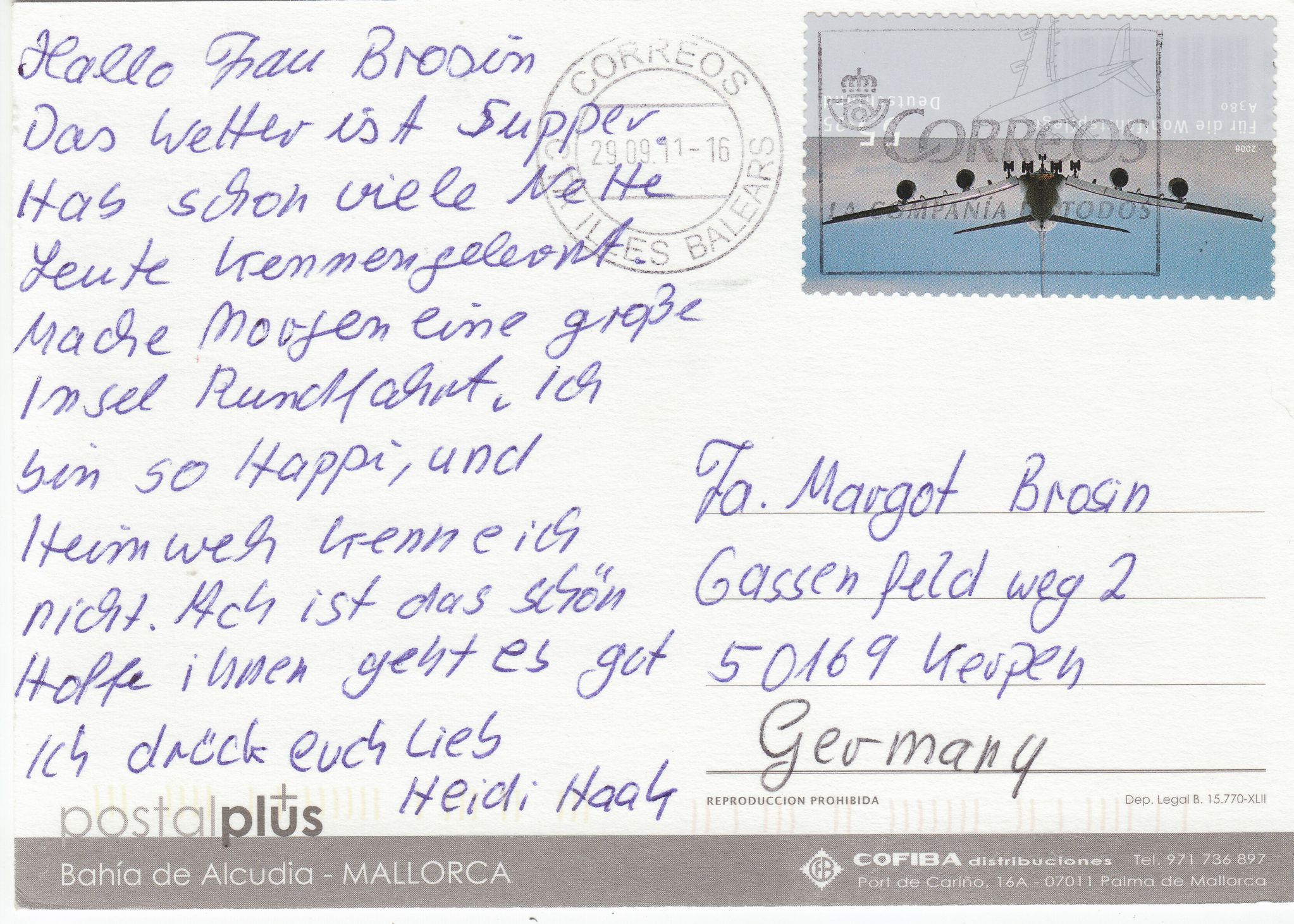 Diese Postkarte wurde am 29.09.2011 frankiert mit einem deutschen Postwertzeichen in Spanien aufgegeben: