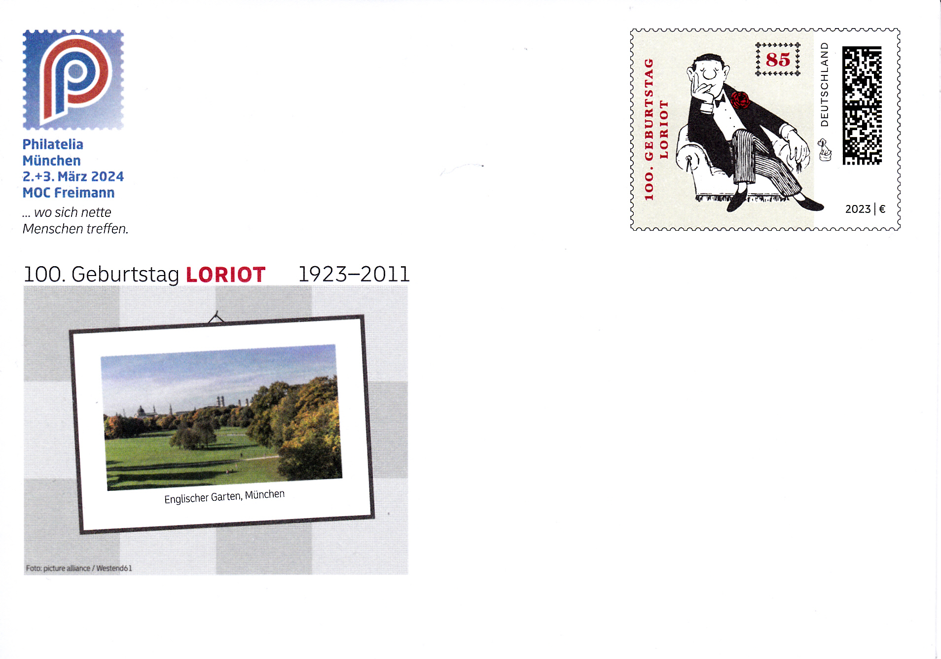 Zur Philatelia in München erschien eine Messeganzsache mit dem Wertzeicheneindruck im Muster der Marke (MiNr 3800) mit von Bülow alias Loriot auf einem Sessel sitzend nach einer Zeichnung von Vicco von Bülow. Hier zeige ich ein ungestempeltes Exemplar.