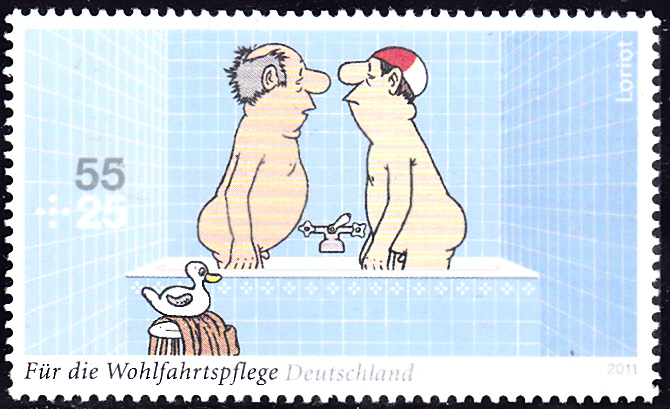 Die Wohlfahrtsmarken 2011 der Deutschen Post zeigten Motive aus Zeichentrickfilmen von Loriot. Auf der Marke zu 45+20 Cent (MiNr 2836) sehen wir eine Abbildung zu "Der sprechende Hund".