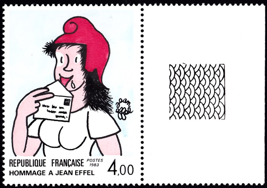 Auf dieser Marke aus Frankreich (MiNr 2415) sehen wir eine Zeichnung "Französin mit Jakobinermütze verschließt Briefumschlag" von Jean Effel.