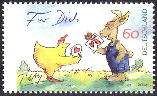 Auf der zweiten Marke dieser Ausgabe (MiNr 3064) wird sein Cartoon "Das Ostergeschenk" gezeigt.