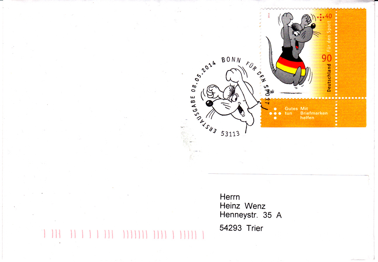 Ersttagsbrief mit dem Wert zu 90 + 40 Cent der Sporthilfemarken 2014 der Deutschen Post (MiNr 3076) mit der Abbildung "Jubelmaus". Der Ersttagsstempel aus Bonn mit der jubelnden Maus passt zum Motiv dieser Marke.