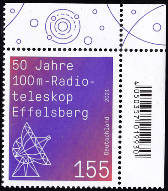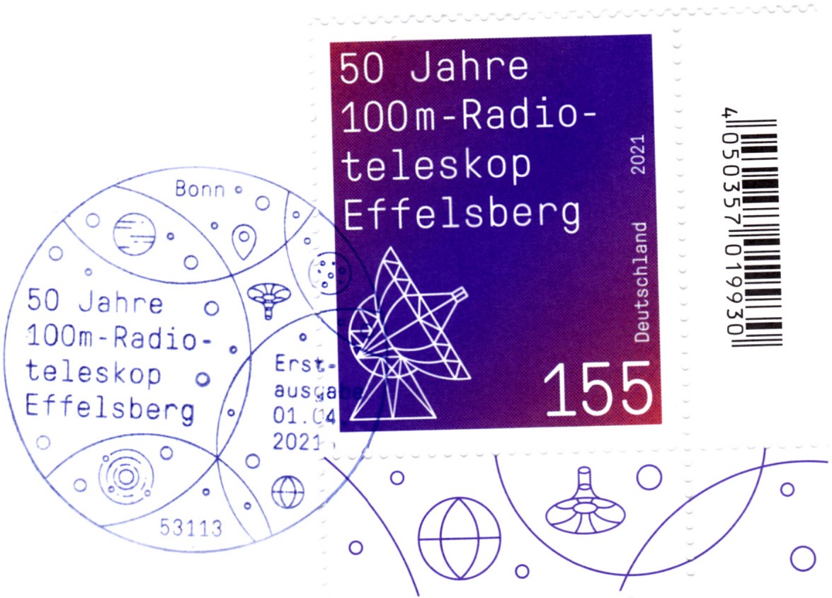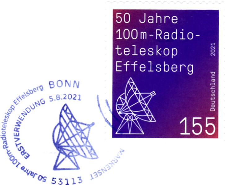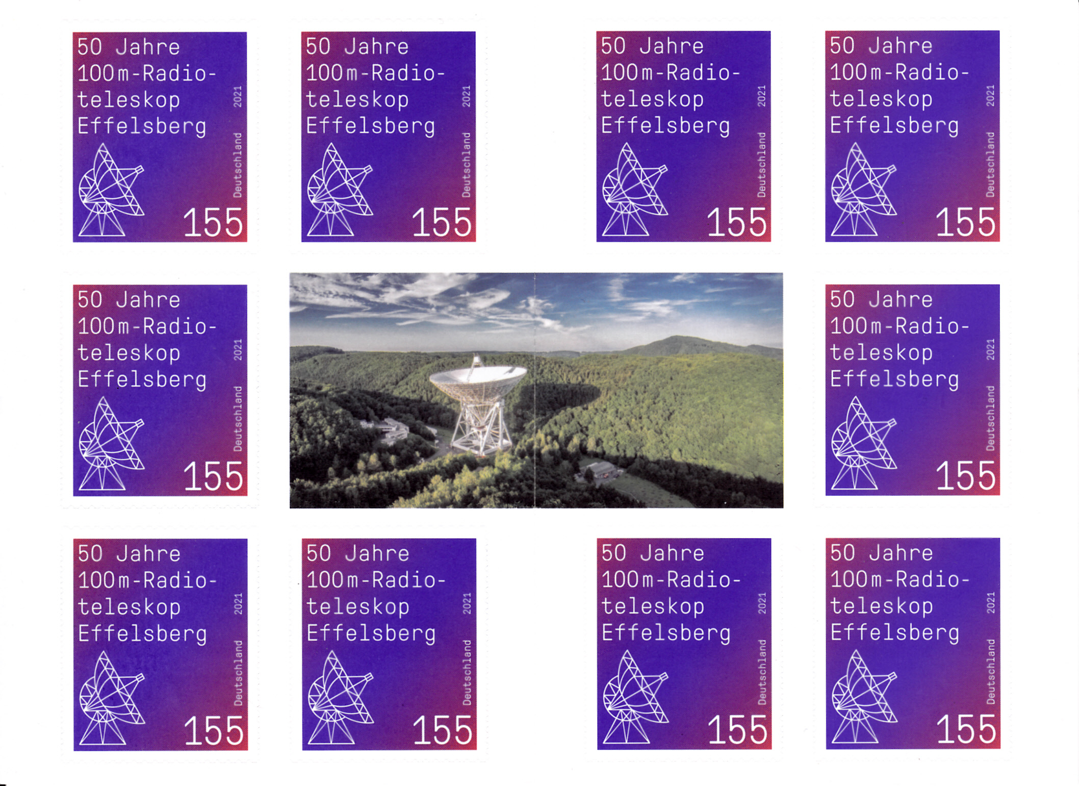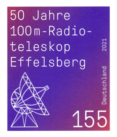 Bei der Deutschen Post ist eine Marke (MiNr 3599) zum Jubiläum "50 Jahre Radioteleskop Effelsberg" erschienen. Sie zeigt die Konturen des Radioteleskopes.