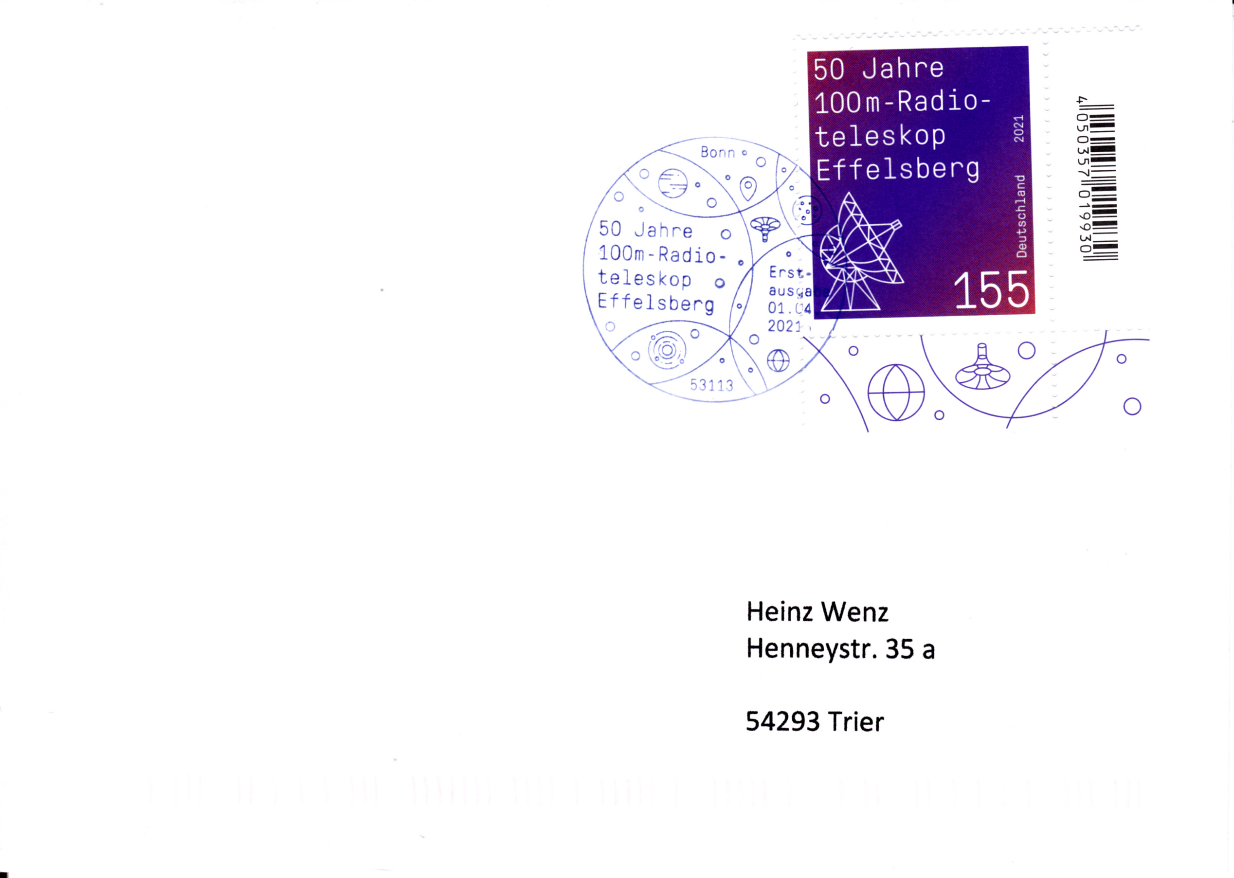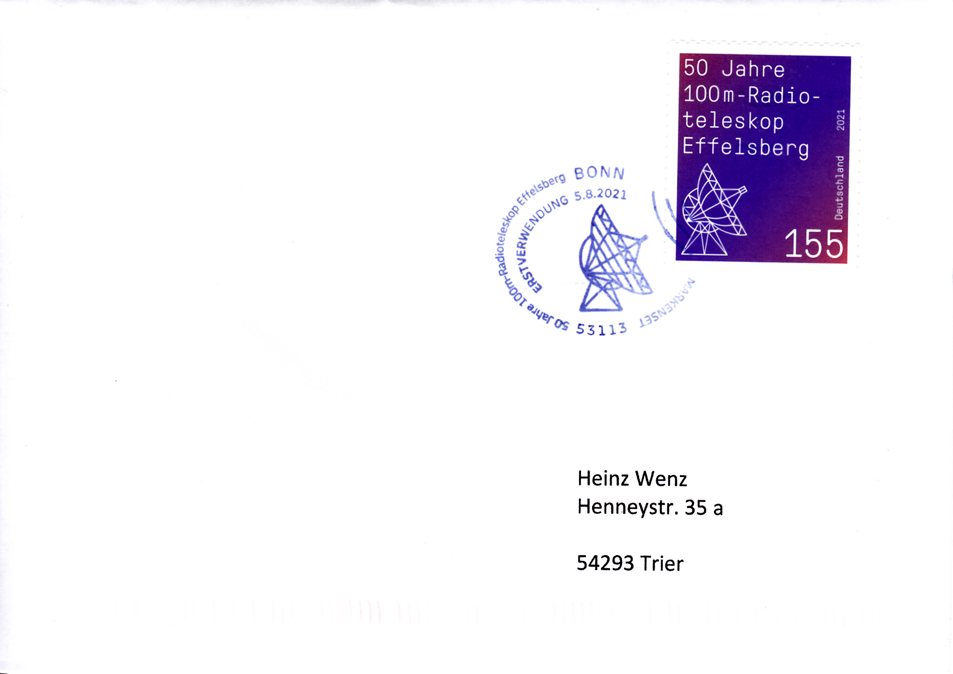 Sonderstempel vom 12.5.2021 aus Bad Münstereifel zum Jubiläum "20 Jahre Radioteleskop Effelsberg".
