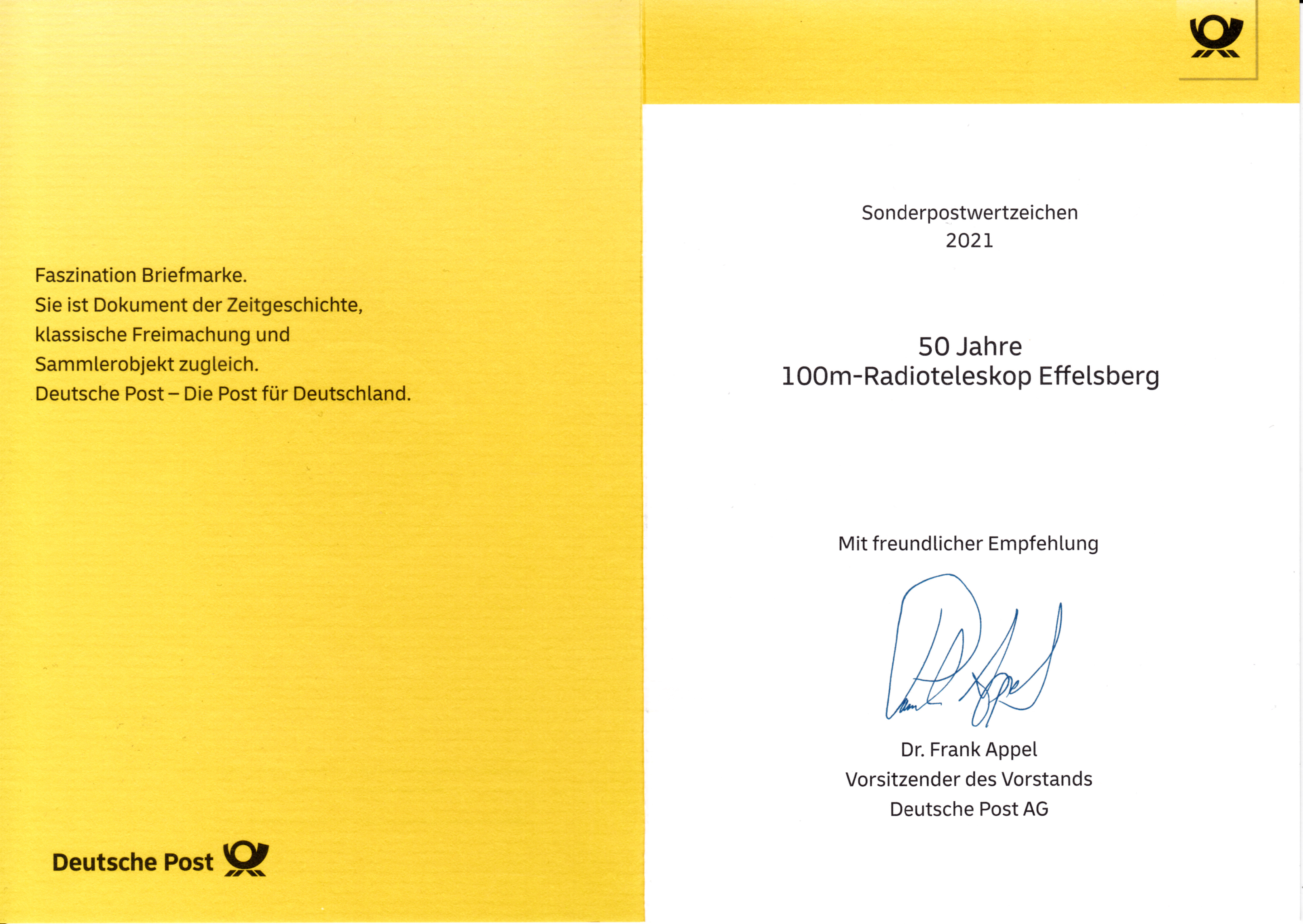 Klappkarte des Vorstandsvorsitzenden der Deutschen Post AG mit der Marke "50 Jahre Radioteleskop Effelsberg" (MiNr 3599) und dem Ersttagsonderstempel Bonn.