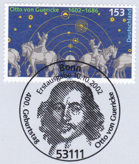 Die Marke der Deutschen Post zum 400. Geburtstag von Otto von Guericke (MiNr 2282) zeigt das Kopernikanisches Weltbild und den Halbkugelversuch mit 16 Pferden nach Kupferstichen aus der "Experimenta nova (ut vocantur) de vacuo spatio" von Otto v. Guericke (1602-1686, Ingenieur und Physiker).