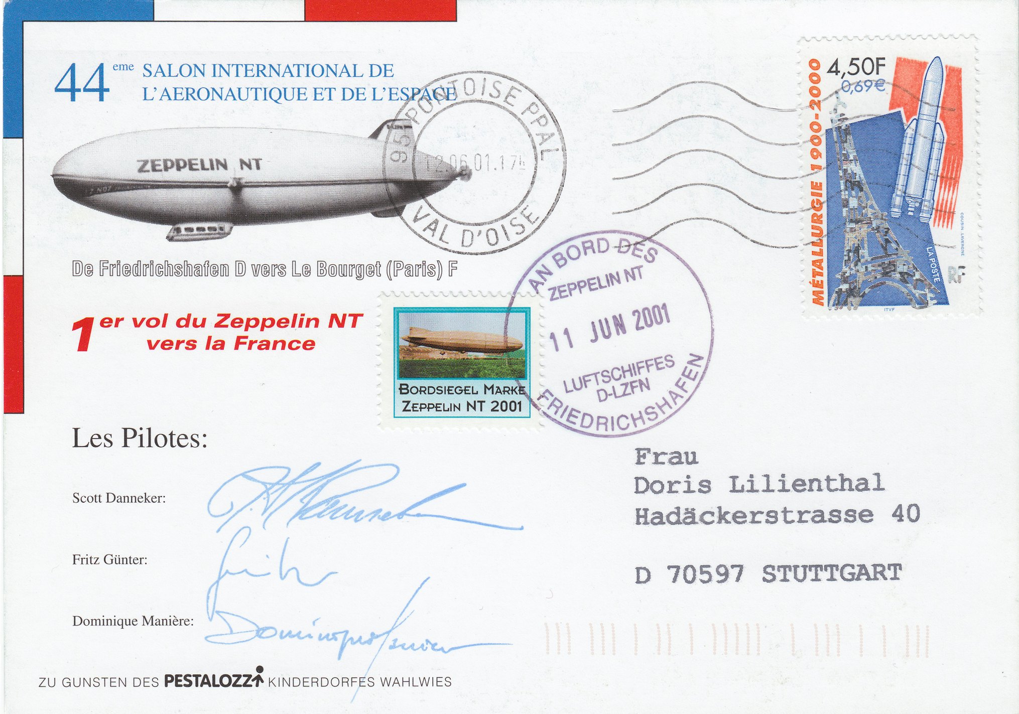 Hier als Beispiel der erste Flug eines ZEPPELIN NT nach Frankreich am 11.06.2001, dokumentiert durch einen Bordstempel: