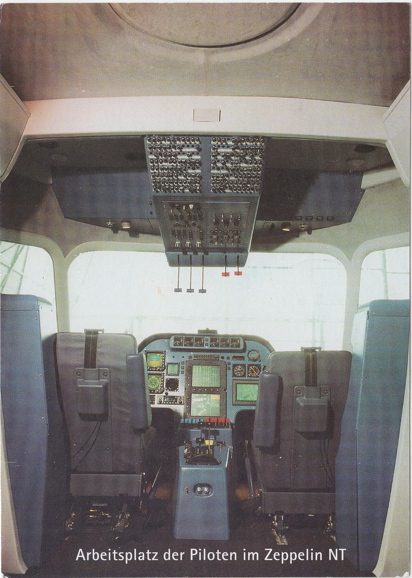 Die Rückseite zeigt den Arbeitsplatz der Piloten im ZEPPELIN NT, der sich vom Cockpit eines Flugzeugs kaum unterscheidet: