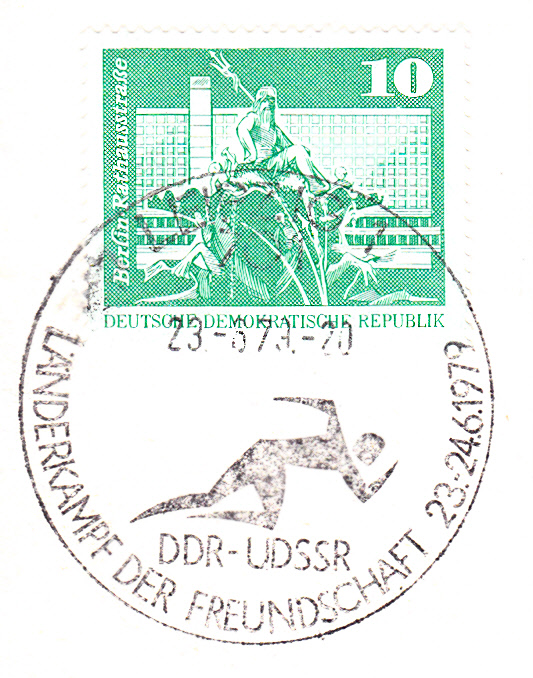 Sonderstempel aus Leipzig vom 23.6.1979 zum Leichtathletik Länderkampf DDR-UdSSR am 23. und 24.6 1979.Im Stempelbild ist ein stilisierter Kurzstreckenläufer beim Start.