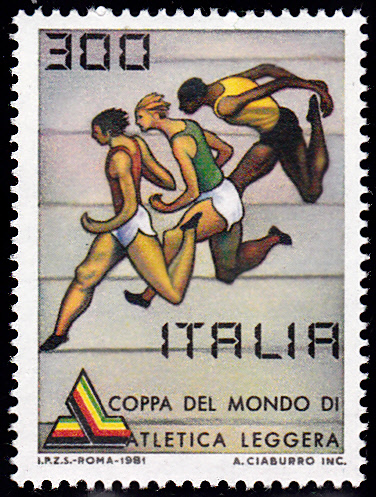 Bei dieser Marke aus Italien (MiNr1770) zum 3. Leichtathletik-Weltcup vom 4. bis zum 6. September 1981 im Olympiastadion von Rom (Italien) werden Läufer beim Zielsprint gezeigt. Es ist am Bild nicht feststellbar ob es sich um Kurz-, Mittel- oder Langstreckenläufer handelt.