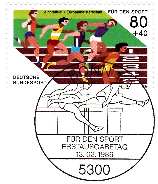 Die Zuschlagsmarke "Für den Sport" zu 80Pf+40Pf der Deutschen Bundespost aus dem Jahre 1986 (MiNr 1269) ist zu den Leichtathletik-Europameisterschaften erschienen und zeigt Kurzstreckenläufer am Ziel. Hier eine Marke mit dem Ersttagsonderstempel Bonn.