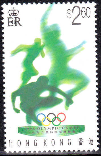 Auf dieser Marke aus einer Serie aus Hongkong (MiNr 764 A a, a = Landesname und Wertangabe schwarzgrau, olympische Ringe mehrfarbig (20.3.1996) A = gez. K 13 1/2) zu den Olympischen Spiele 1996 ist neben einem Sprinter und einem Weitspringer auch ein Hürdenläufer zu sehen.
