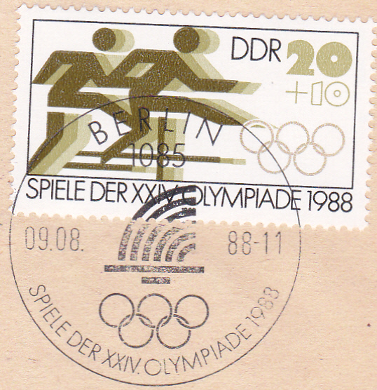 Briefausschnitt mit der bereits hier gezeigten Marke zu 20+10Pf aus der DDR (MiNr 3185) mit der stilisierten Darstellung zweier Hürdenläufer und dem dazu passenden Ersttagsonderstempel Berlin.