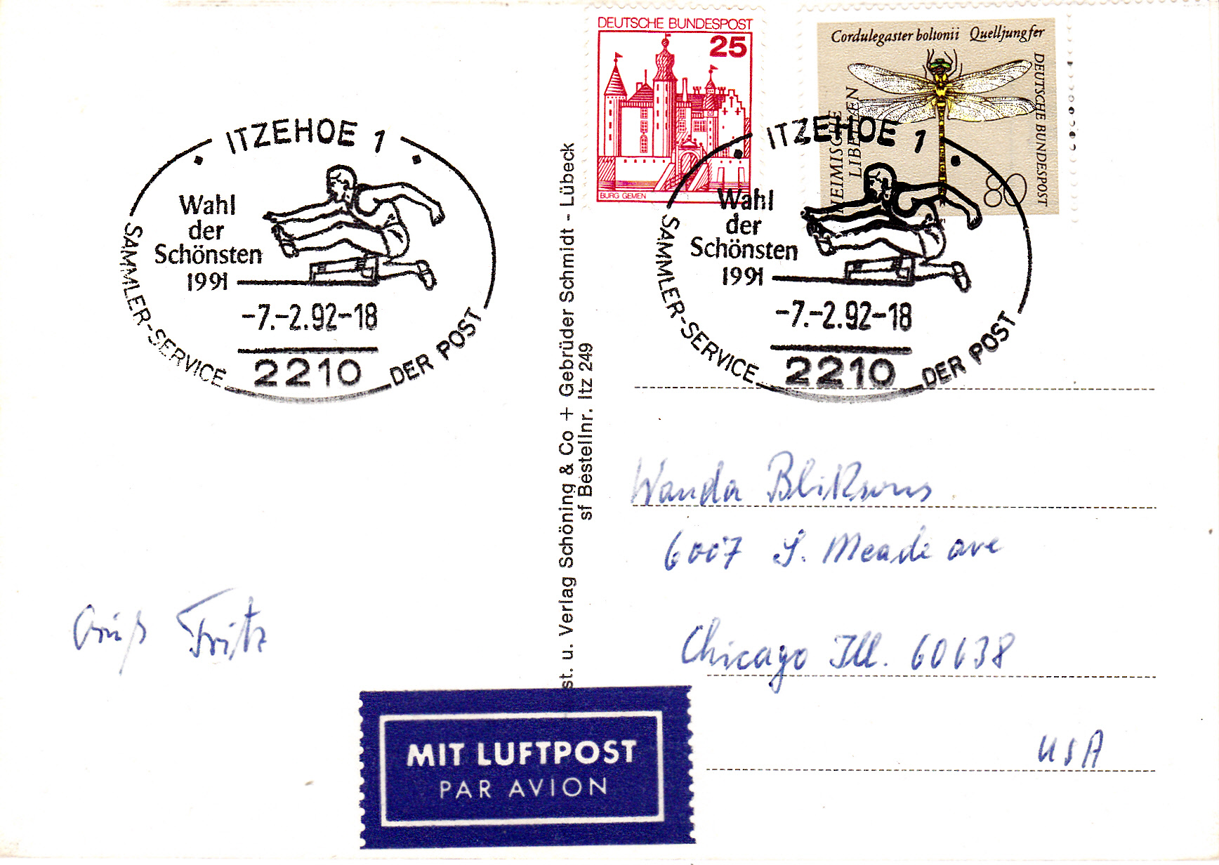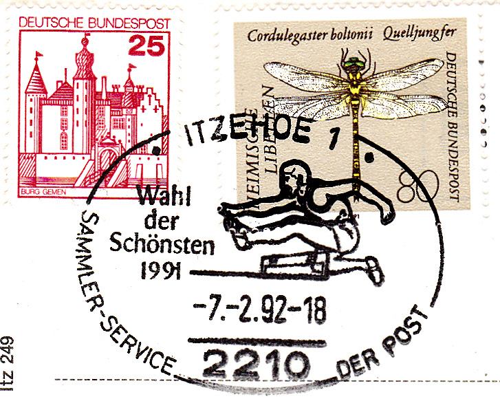 Sonderstempel aus Itzehoe vom 7.2.1992 zur "Wahl der Schönsten 1991" mit einem Hürdenläufer im Stempelbild auf einer Auslandspostkarte mit Luftpost in die USA. Das Porto betrug für eine Auslandspostkarte 80Pf und der Luftpostzuschlag in die USA 25Pf (Ländergruppe 1).