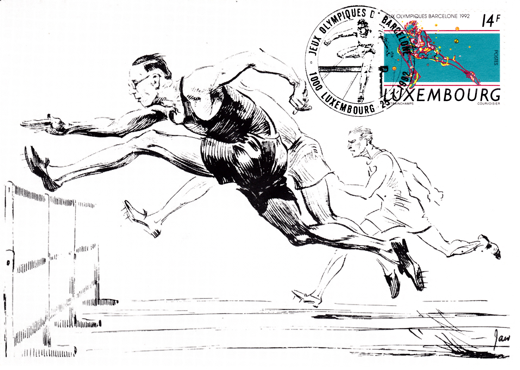 Der Sonderstempel aus Luxemburg vom 25.7.1992 zu den Olympischen Spielen 1992 in Barcelona mit einem Hürdenläufer im Stempelbild wurde hier auf einer Maximumkarte mit der passenden Marke zu den Spielen abgeschlagen.