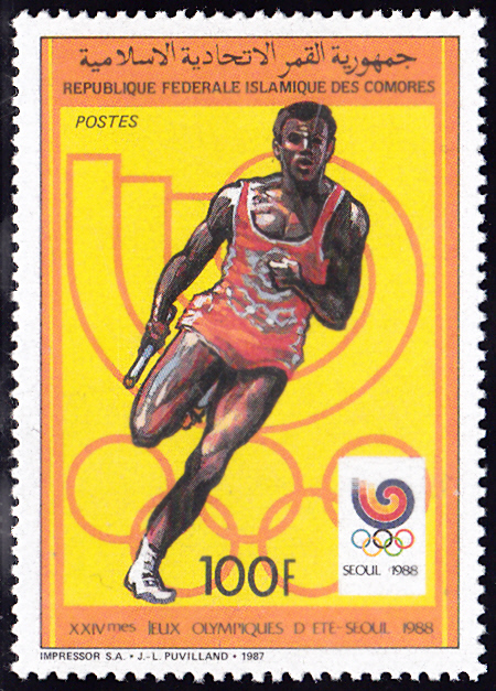 Auf den Komoren (ein Inselstaat im Indischen Ozean am nördlichen Ausgang der Straße von Mosambik zwischen Mosambik und Madagaskar) ist diese Marke (MiNr 812 A) in einer Serie zu den Sommerspielen 1988 mit einem Staffelläufer erschienen.