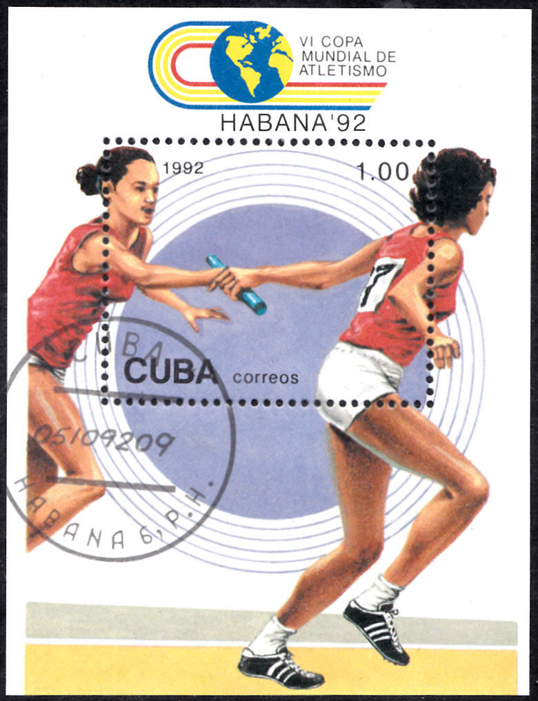 Dieser Block (MiNr Block 130 mit Marke MiNr 3613) mit zwei Läuferinnen beim Wechsel bei einem Staffellauf ist in einer Ausgabe aus Kuba zum 6. Leichtathletik-Weltcup erschienen.