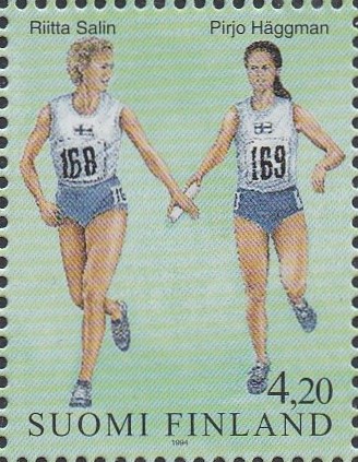 Auf dieser Marke aus Finnland (MiNr 1251) werden die beiden Sprinterinnen Riitta Salin und Pirjo Häggma bei einem Wechsel im Staffellauf (4x400m) gezeigt.
