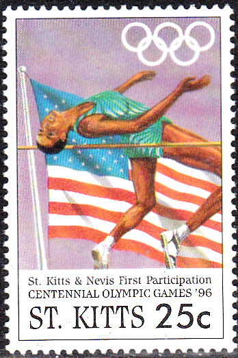 Auf dieser Marke (MiNr 423) aus St. Christopher (St. Kitts) zur ersten Teilnahme von Sportlern von St. Kitts und Nevis an Olympischen Spielen 1996 ist ein Hochspringer abgebildet.
