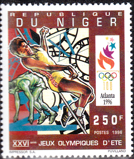 Zu den Olympischen Spielen 1996 erschien in der gleichen Serie im Niger auch diese Marke (MiNr 1230), die einen Hochspringer kurz nach dem Überqueren der Latte abbildet.