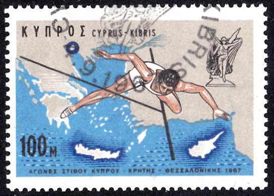 Auf Zypern erschien 1967 diese Marke (MiNr 297) zu den Leichtathletik-Spiele zwischen Zypern, Kreta und Saloniki 1967 auf Zypern mir der Abbildung eines Hochspringers im Stil der damaligen Zeit. Außerdem werden eine Landkarte des Ägäischen und Kretischen Meeres mit den eingezeichneten Teilnahmeplätzen und das Emblem der Spiele (Göttin Nike des Paionios) gezeigt.