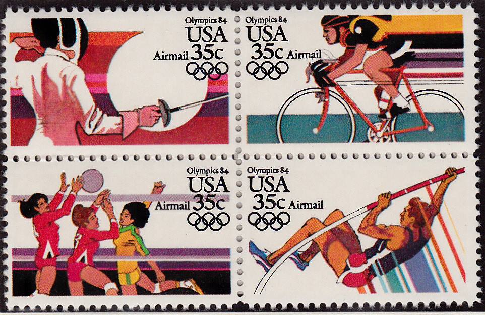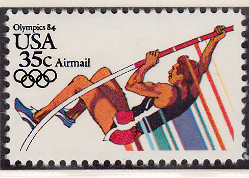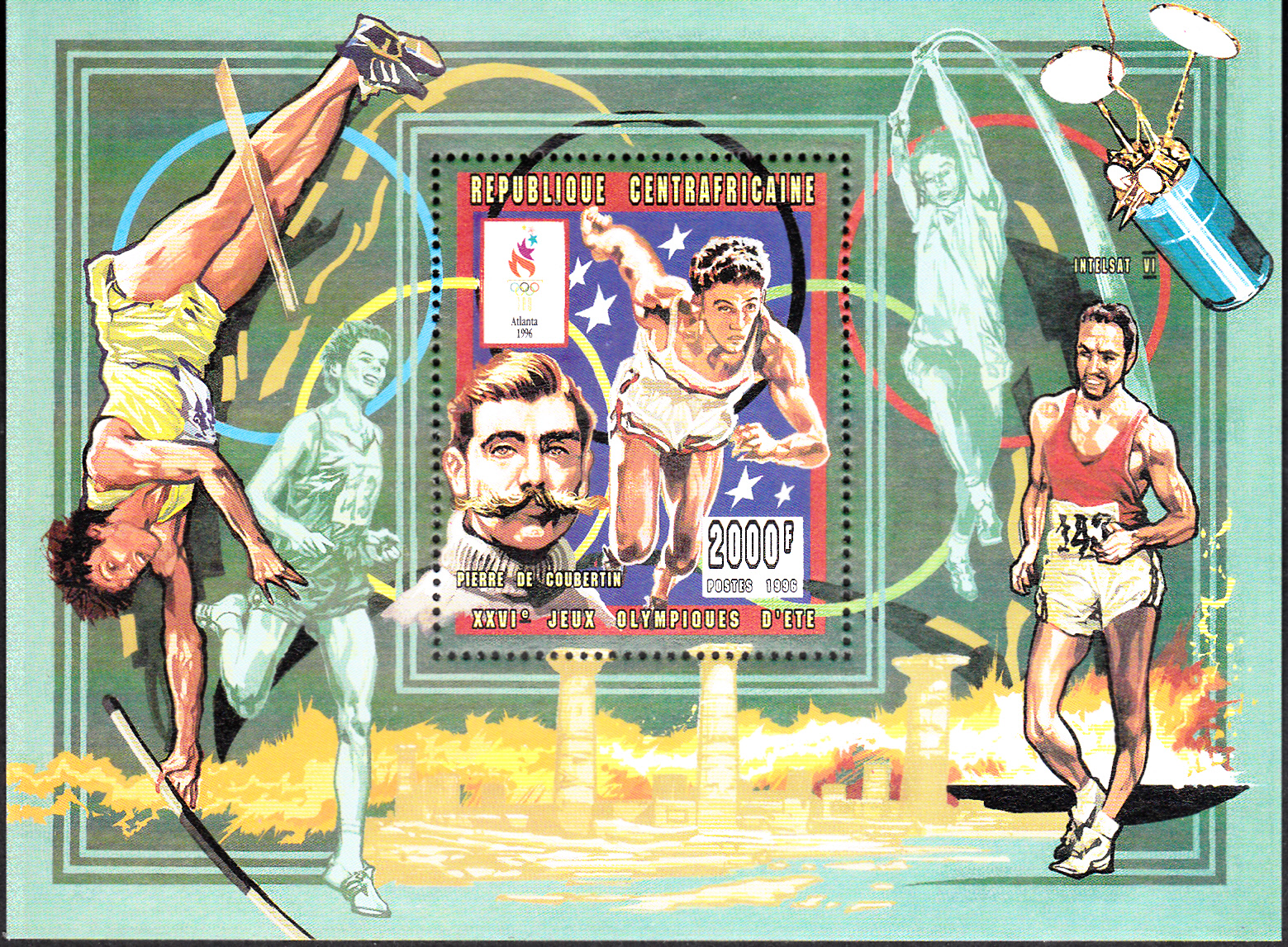Aus der Zentralafrikanische Republik kommt dieser Block (MiNr Block 580 A mit Marke MiNr 1696) zu den Olympischen Spielen 1996. Auf dem Blockrand ist rechts im Hintergrund ein Stabhochspringer beim Aufschwingen und lecks auf dem Blockrand beim Überqueren der Latte zu sehen.