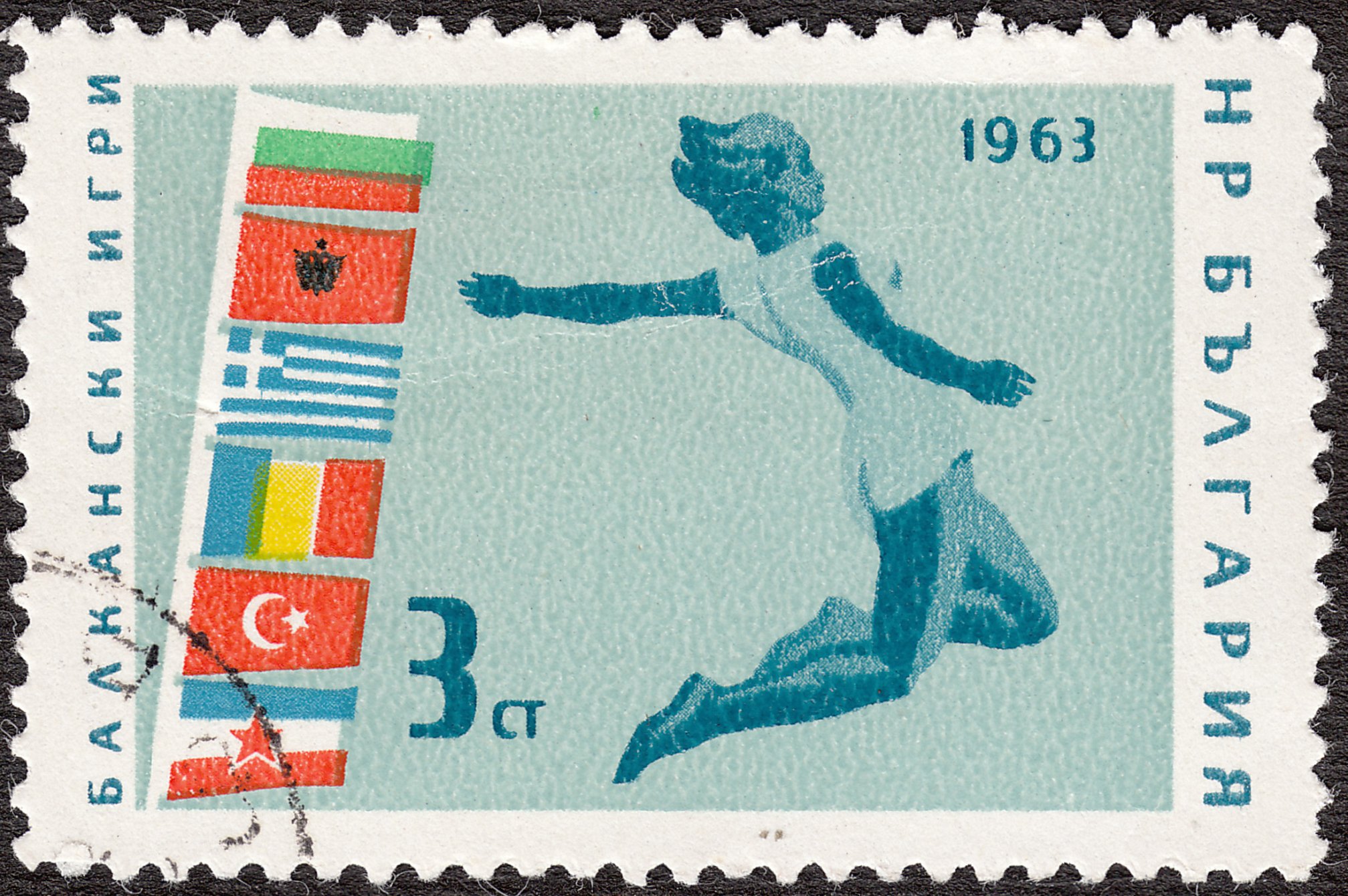 Dieses Postwertzeichen aus Bulgarien (MiNr 1401), erschienen am 13.09.1963 aus Anlaß der XXII. Balkanspiele, die 1963 in Sofia stattfanden, zeigt uns eine Weitspringerin: