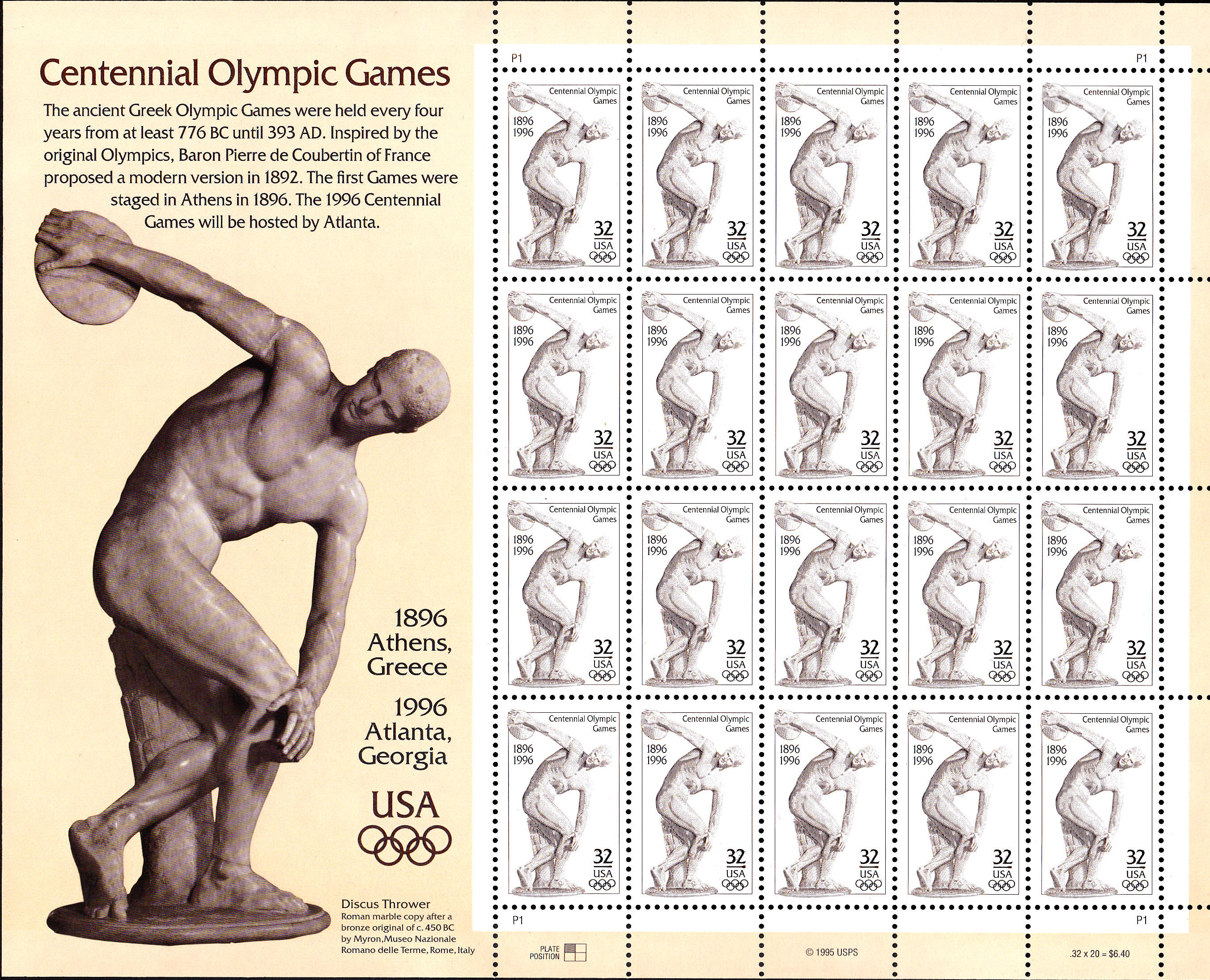 In den USA erschien am 19. Juli 1996 diese Marke zum Thema "100 Jahre Olympische Spiele der Neuzeit, Olympische Sommerspiele, Atlanta" diese Marke (MiNr 2750) mit der Abbildung einer römische Kopie des kompletten Diskobol des Myron (um 450 v. Chr.).