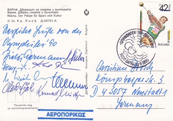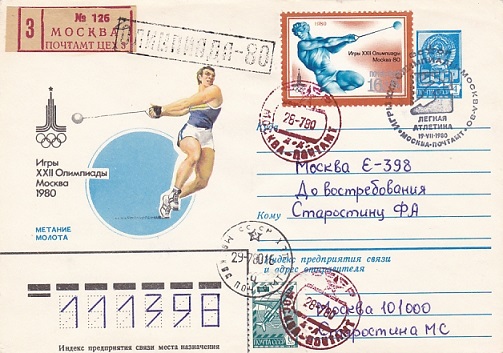 Und dieselbe Ganzsache hier als Einschreiben mit Zusatzfrankatur der Zuschlagssondermarke (16 + 6 Kopeken), die auch einen Hammerwerfer zeigt.