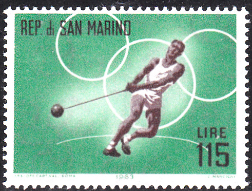 Zu den Leichtathletik-Europameisterschaften 1962 in Belgrad erschien in Polen diese Marke (MiNr 1345 A) mit der Abbildung eines stilisierten Hammerwerfers.
