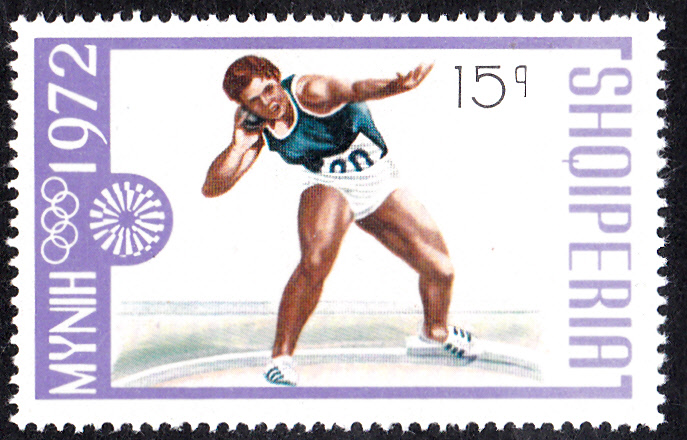 Diese Marke aus einem Satz aus Albanien (MiNr 1558) zu den Olympischen Spielen 1972 zeigt einen Kugelstoßer.