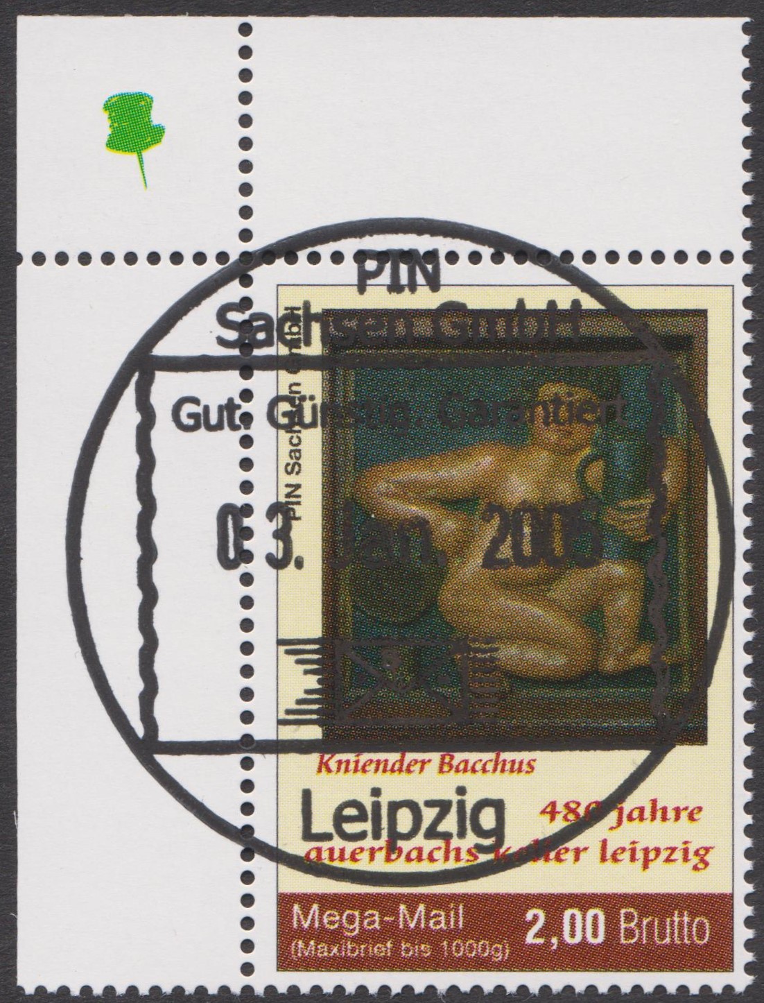 Dieses Postwertzeichen der PIN Sachsen GmbH zeigt das Logo des Restaurants Auerbachs Keller in Leipzig, hier eine gestempelte linke obere Bogenecke mit Stempel vom 03.01.2005 (= Ersttag):