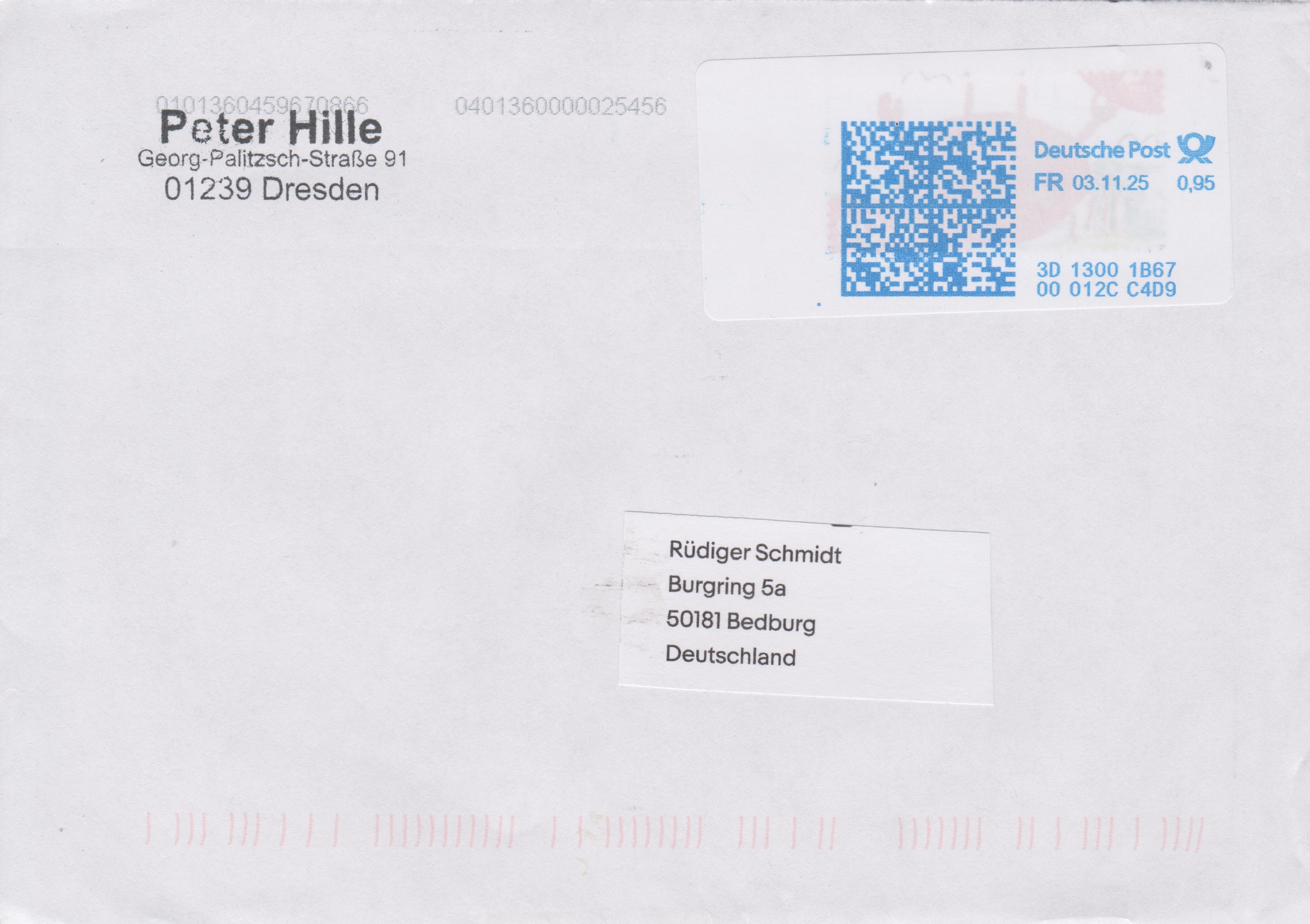 Brief aus Dresden, bei dem eine Privatpostmarke mit einem Label überklebt wurde: