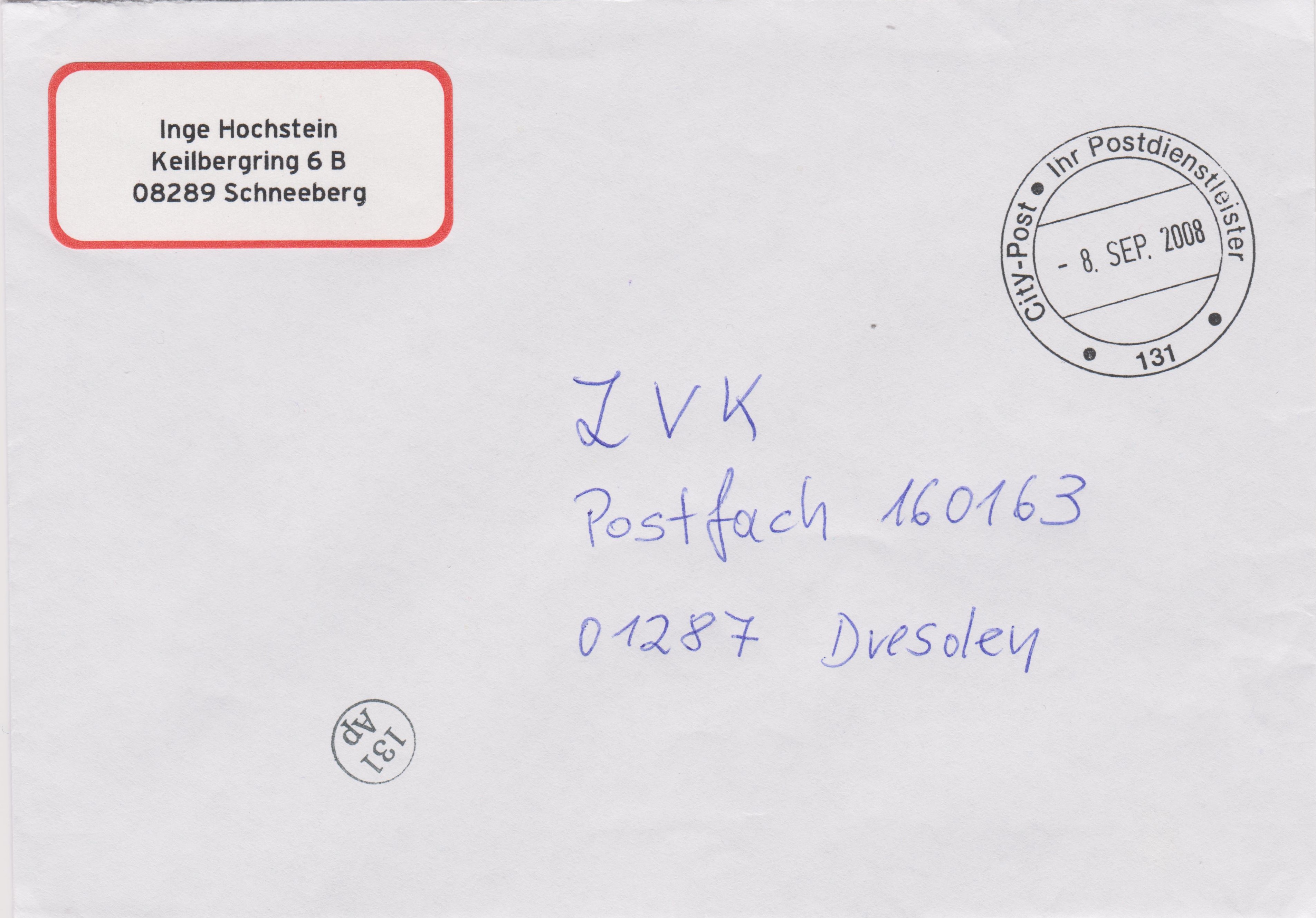 Brief vom 08.09.2008 mit Zweikreisstegstempel "City-Post Ihr Postdienstleister 131" sowie Fingerhutstempel "131 Ap":