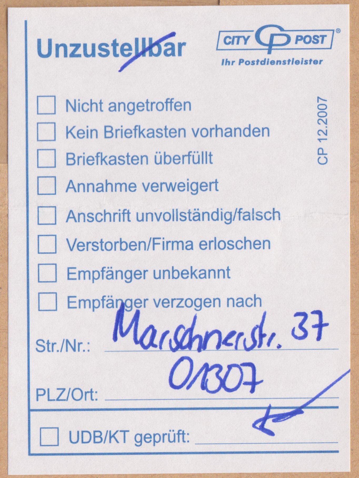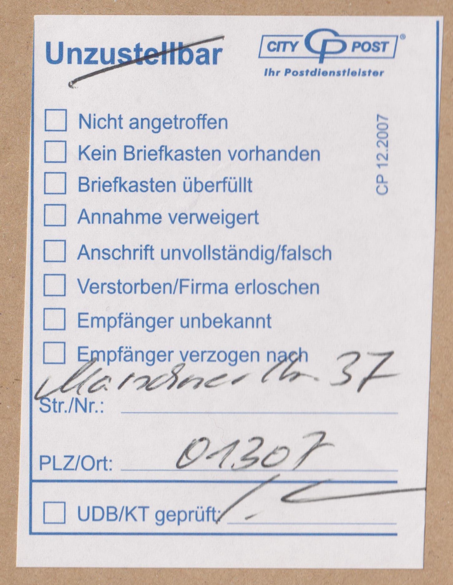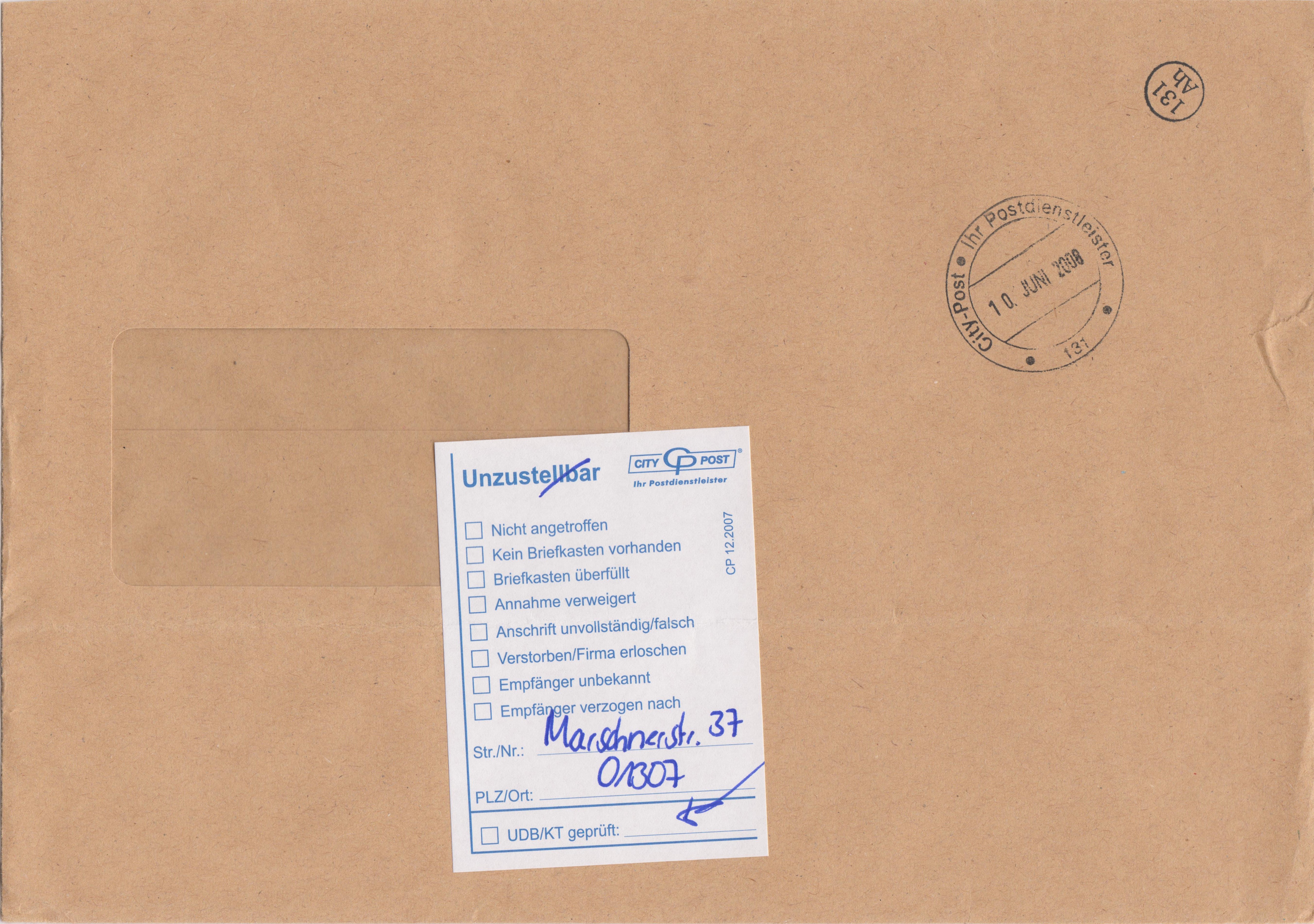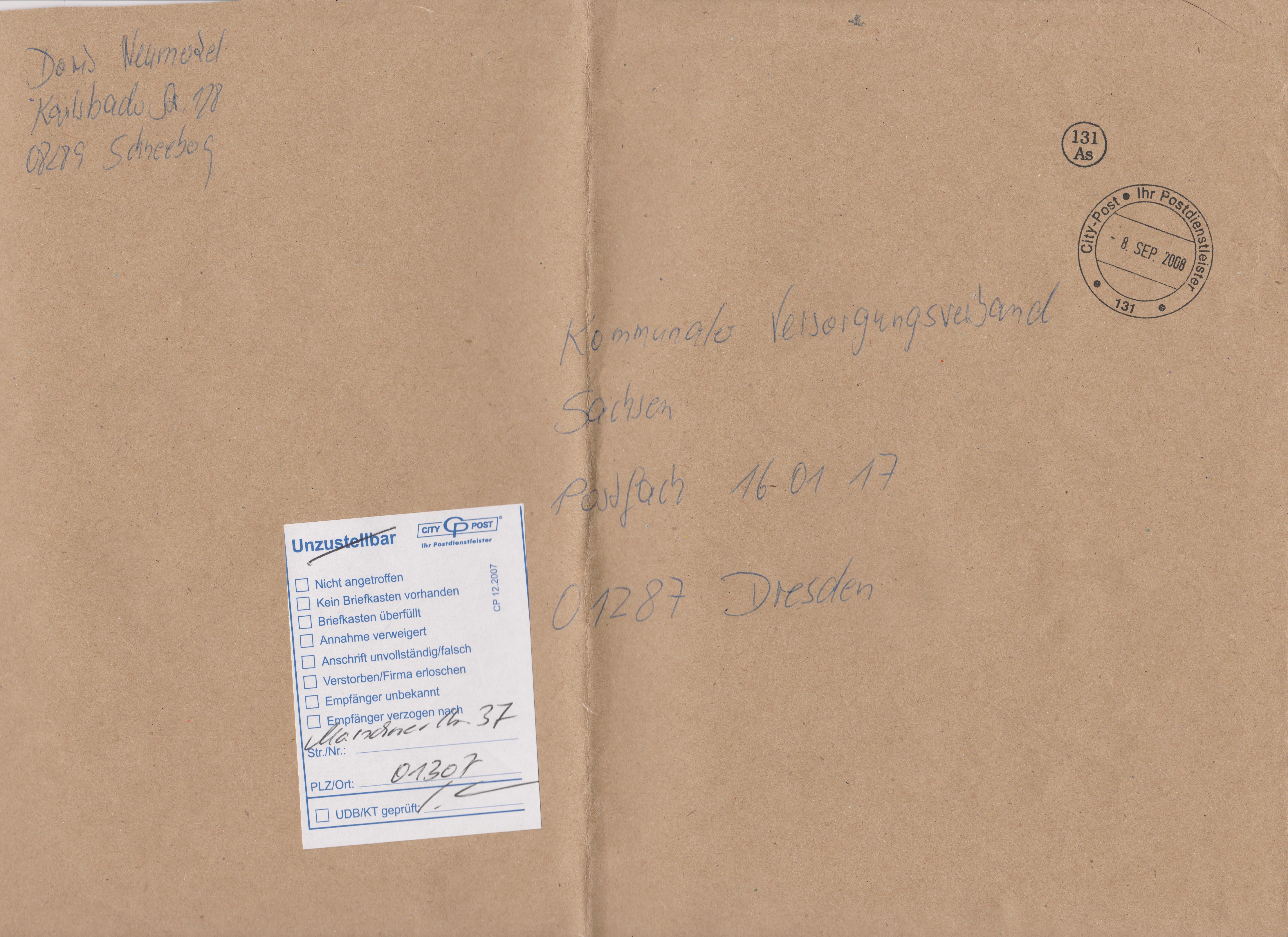Der an die Postfachadresse in 01287 Dresden adressierte Brief wurde von der City-Post umgeletet an die Zustelladresse "Marschnerstr. 37" bei PLZ (= Postleitzahl) "01307", worauf ein Aufkleber Vordruck "Unzustellbar" hinweist, der hier zweckentfremded eingesetzt wurde, weshalb man das "Unzustellbar" durchgestrichen hat: