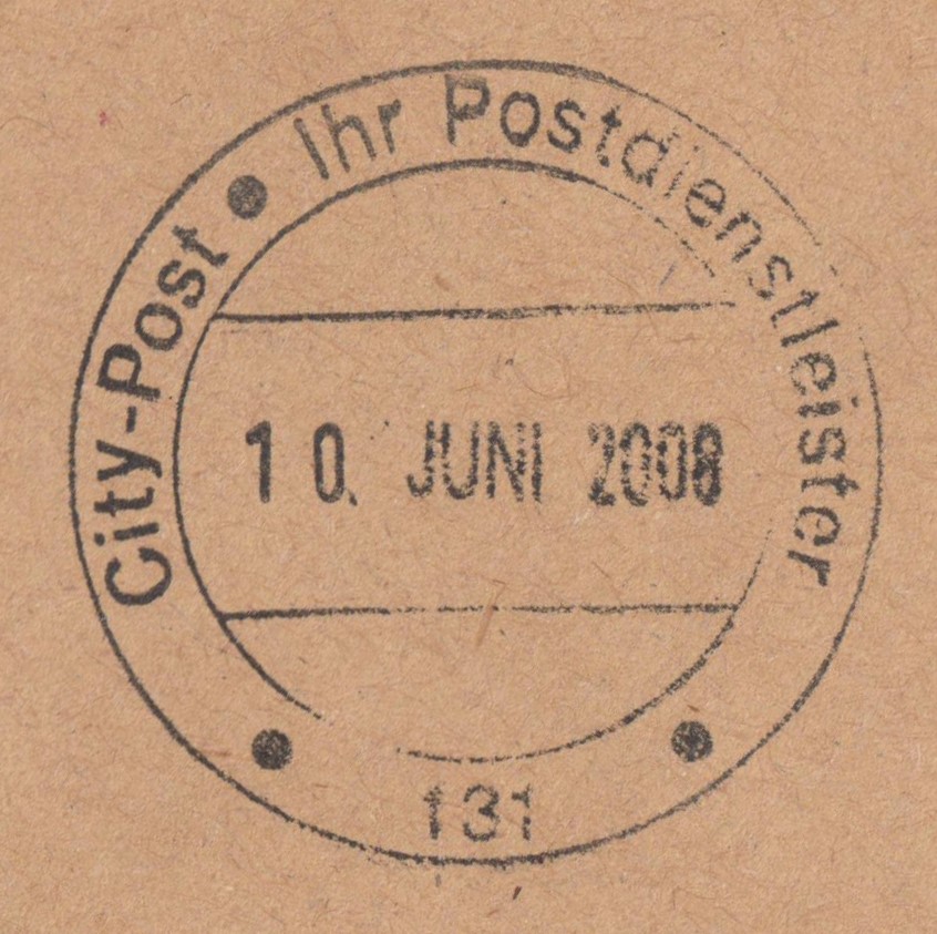 Brief vom 10.06.2008 mit Zweikreisstegstempel "City-Post Ihr Postdienstleister 131" sowie Fingerhutstempel "131 Ah":