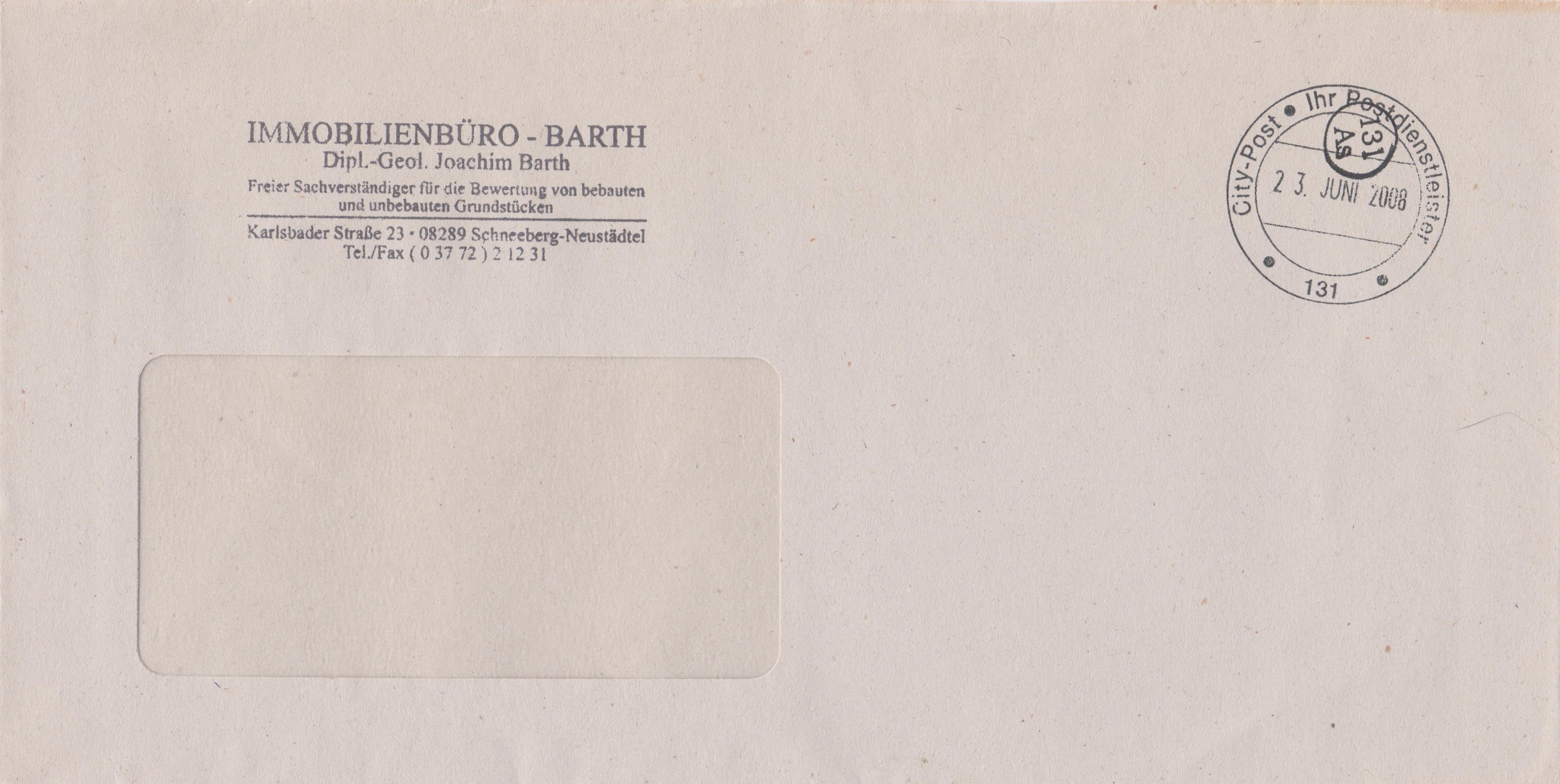 Brief vom 23.06.2008 mit Zweikreisstegstempel "City-Post Ihr Postdienstleister 131" sowie Fingerhutstempel "131 As":