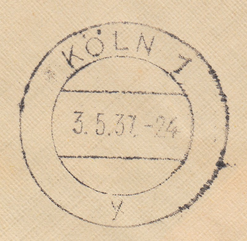 In Köln erhielten diese Poststücke um Mitternacht des 03.05.1937 dann jeweils einen TSt als Ankunftsstempel, im Falle dieses Beispiels einen TSt ''KÖLN 1 (e) -3.5. 37.-24''.