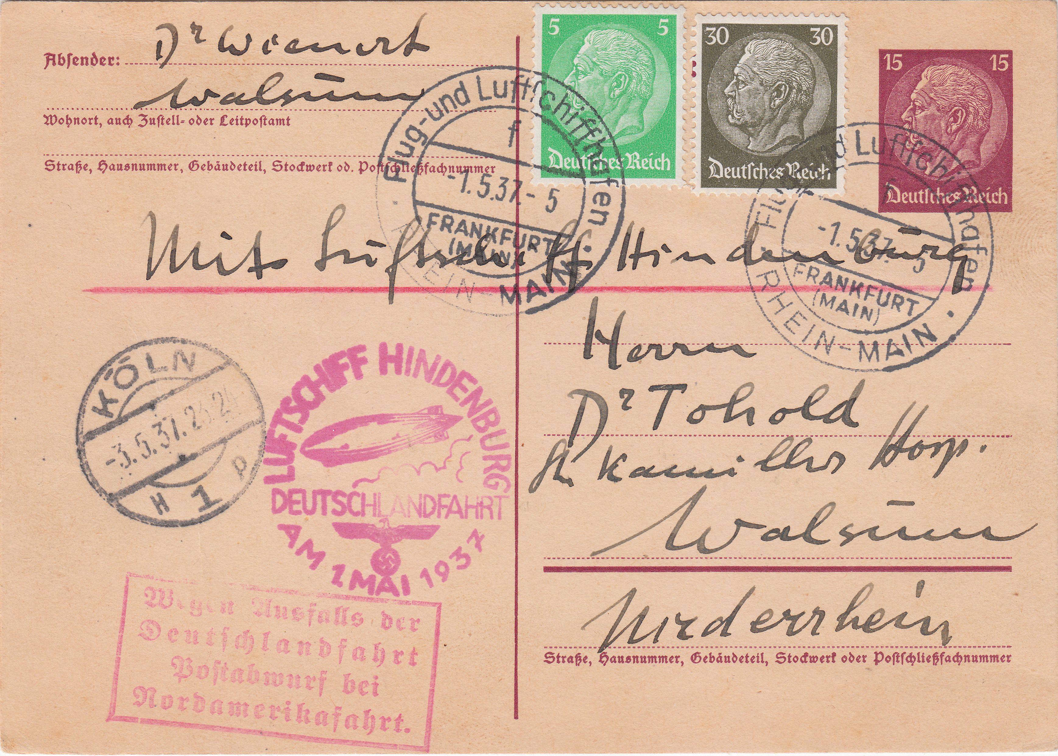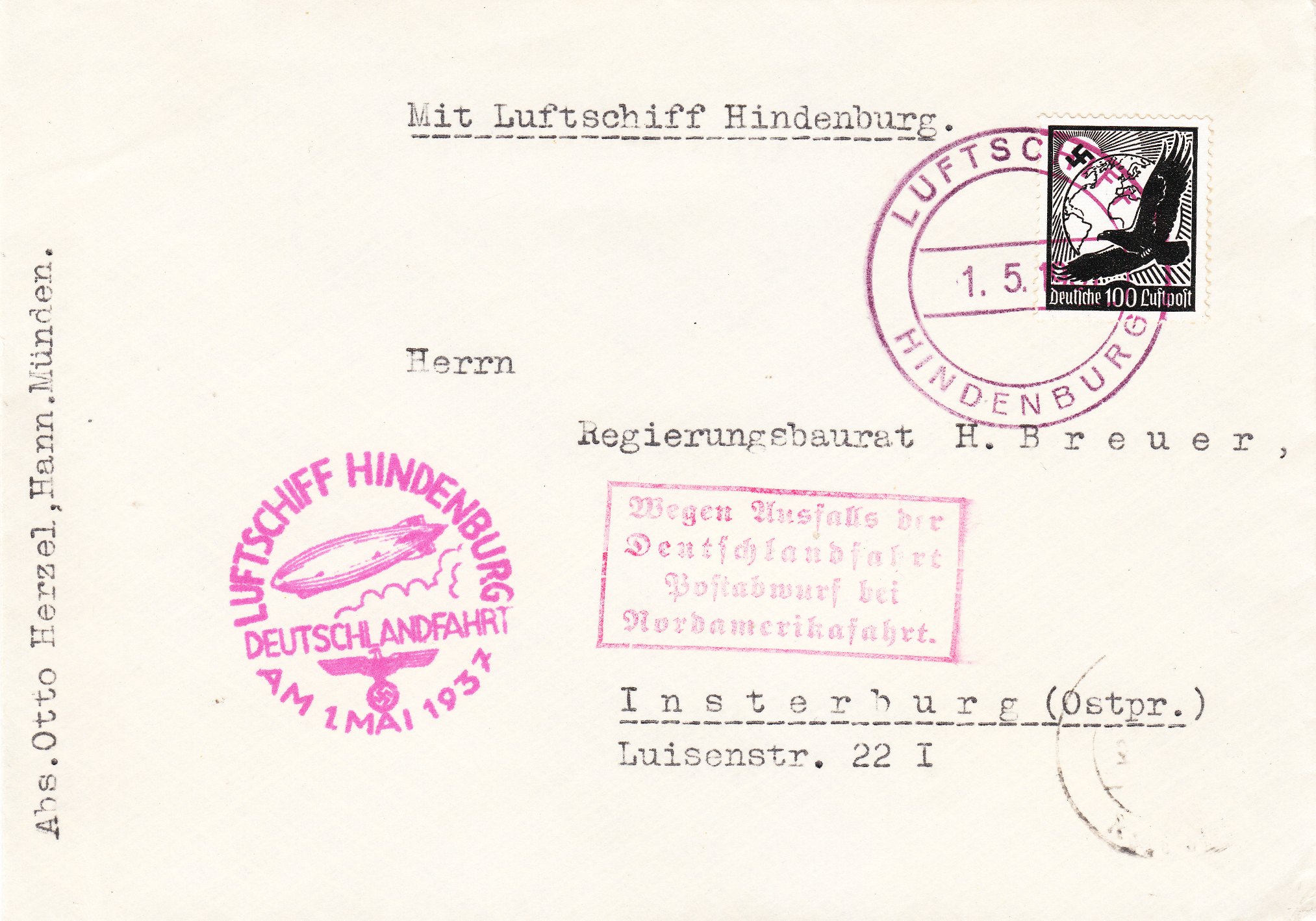 Bestätigungsstempel in rotlila ''LUFTSCHIFF HINDENBURG DEUTSCHLANDFAHRT AM 1.MAI 1937''.