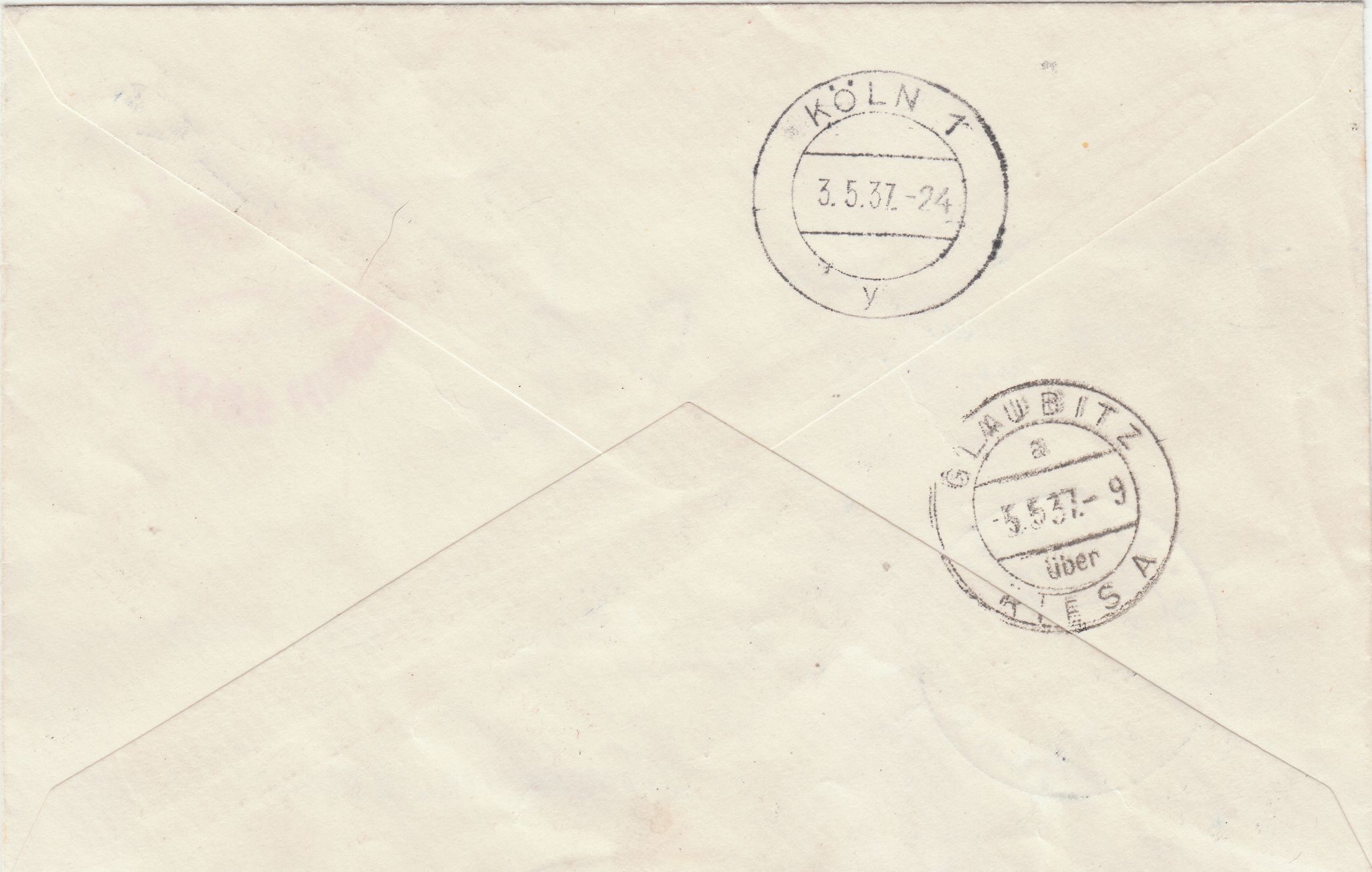 Rückseitig Ankunftsstempel Köln 1 mit Kennbuchstabe "y" sowie "GLAUBITZ über RIESA" vom 05.05.1937:
