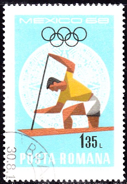 Ebenfalls aus Rumänien kommt diese Marke (MiNr 2702) Sommerspielen 1968 mit einem Einer-Canadier.