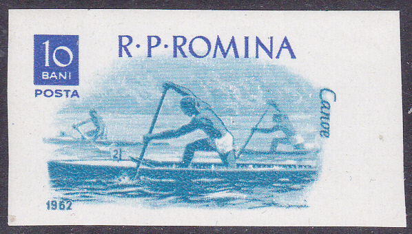 Die hier schon früher gezeigte gezähnte Marke aus der 1964 erschienenen Serie "Olympiasieger" aus Rumänien zum Gewinn von zwei Goldmedaillen durch Leon Rotman im Einer-Canadier gibt es in einer etwas anderen Farbe auch geschnitten (MiNr 2353).