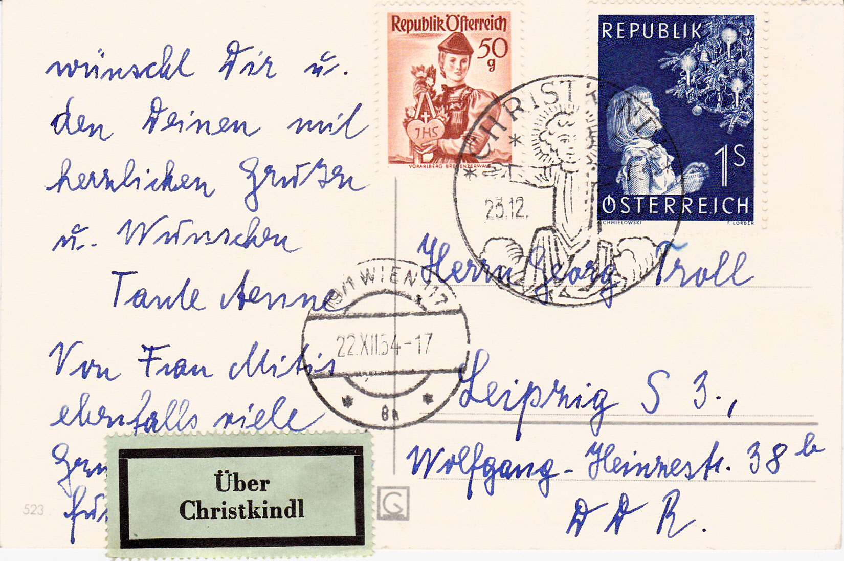 Hier eine in Wien aufgegebene und in die DDR adressierte Postkarte mit dem Sonderstempel Christkindl vom 23.12.1954 und mit einem Leitzettel "Über Christkindl":