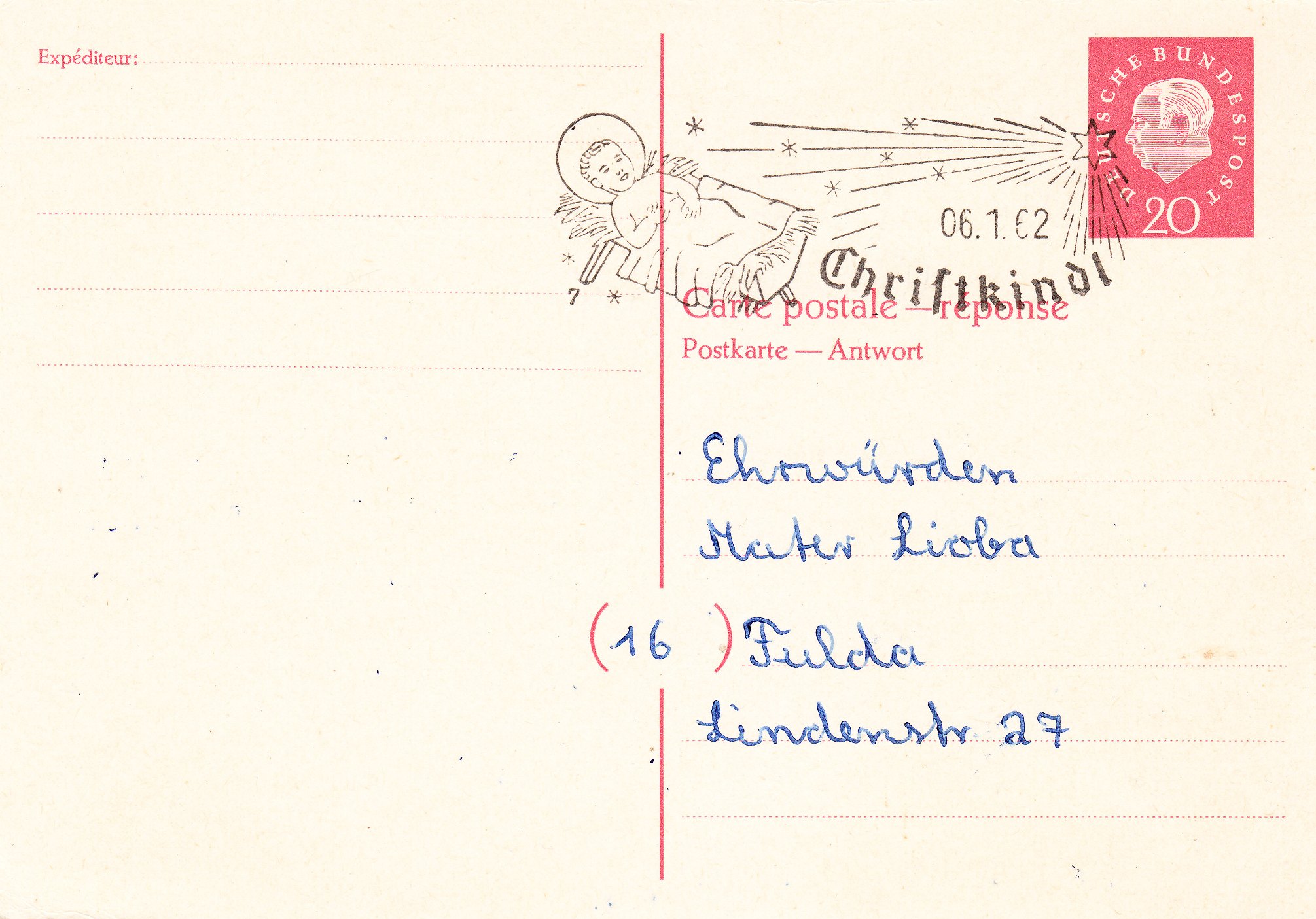 Hier eine recht seltene Antwortkarte Bund P 52 A mit dem Sonderstempel "CHRISTKINDL" des Jahres 1961 mit der Kennziffer "7", abgeschlagen am 06.01.1962: