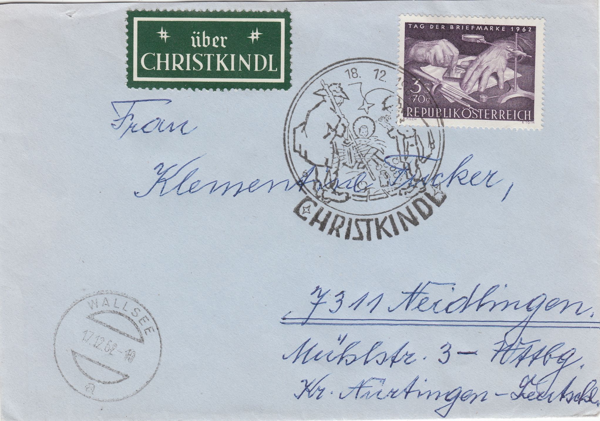 Hier der 1962 eingesetzte Sonderstempel CHRISTKINDL mit der Kennziffer "6" am 18.12.1962 gebraucht auf einem Brief nach Deutschland, aufgegeben mit Leitzettel "über CHRISTKINDL" am 17.12.1962 in "WALLSEE":