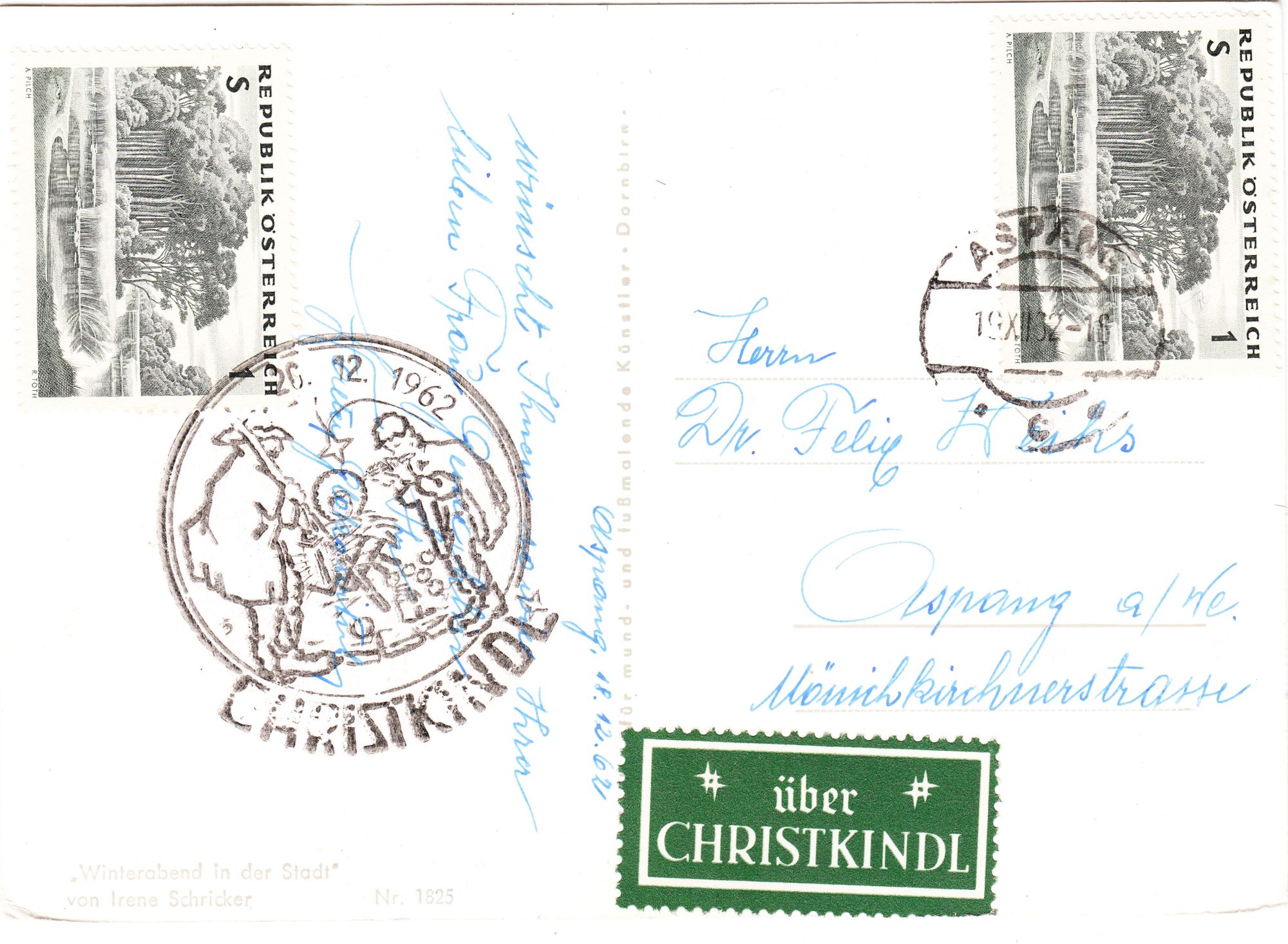 Hier der 1962 eingesetzte Sonderstempel CHRISTKINDL mit der Kennziffer "5" am 20.12.1962 gebraucht auf einer Postkarte nach Aspang, aufgegeben mit Leitzettel "über CHRISTKINDL" am 19.12.1962 in "ASPANG":