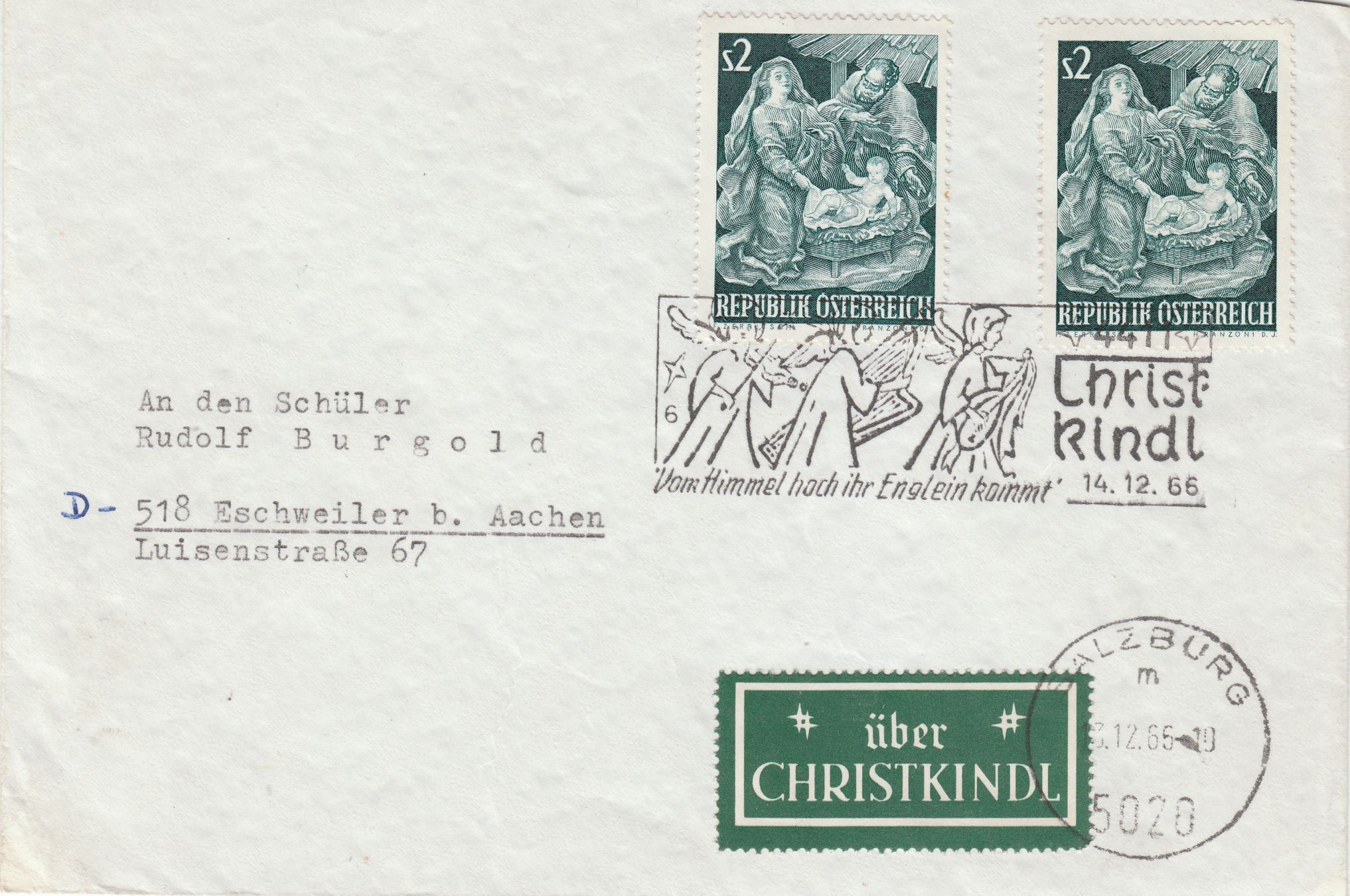 Dieser Beleg wurde mit einem Klebezettel "über Chriskindl" versehen am 13.12.1966 in Salzburg aufgegeben und der Klebezettel wurde dort per Tagesstempel entwertet: