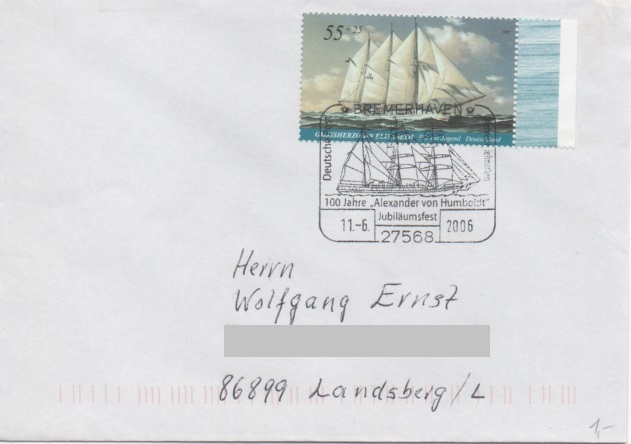 Im Jahr 2008 war die ALEXANDER VON HUMBOLDT seit 20 Jahren als Segelschiff unterwegs, woran dieser Sonderstempel erinnert.